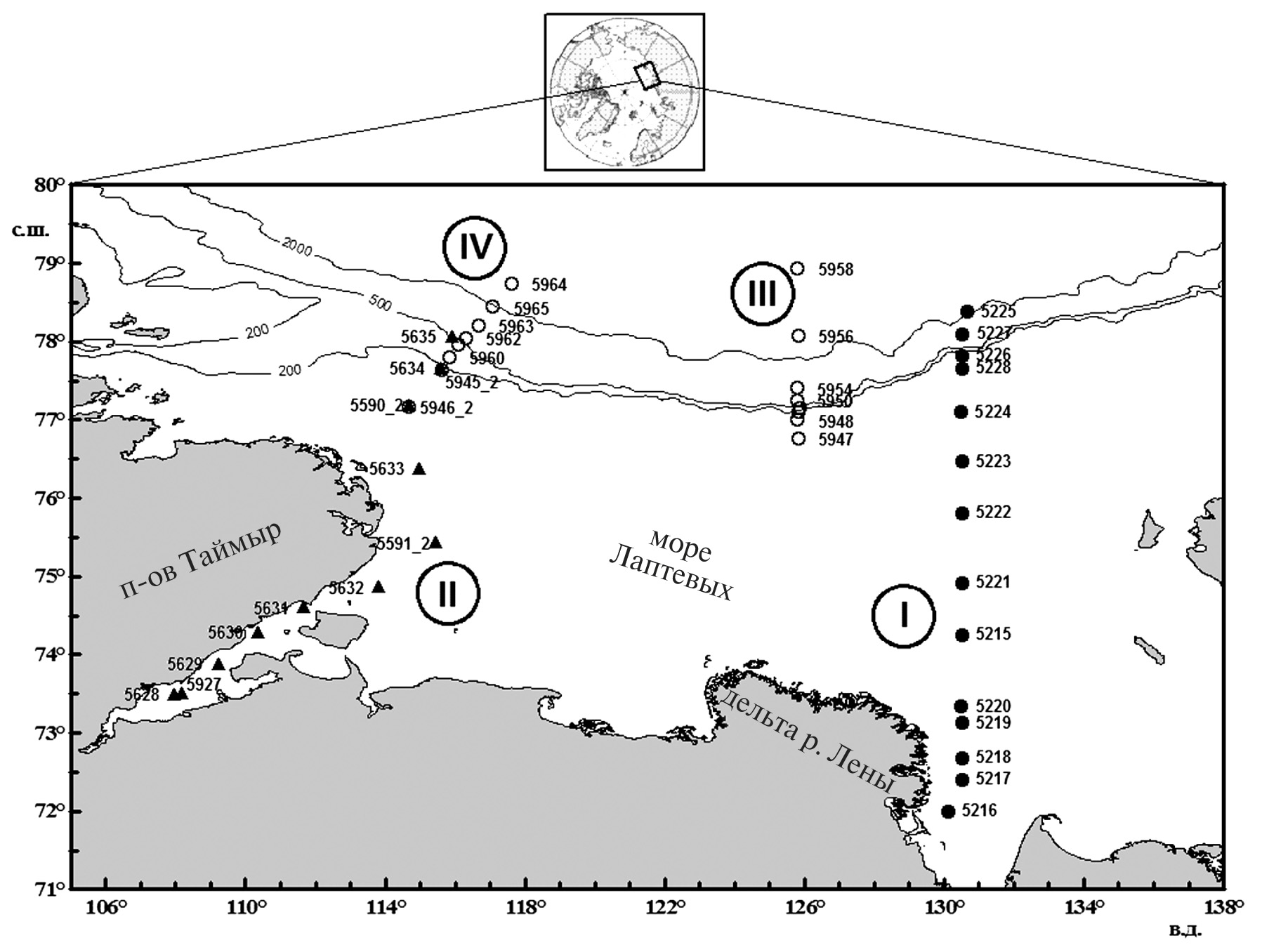 Море Лаптевых занимает ключевое место в геохимическом цикле углерода морей Сибирской Арктики и всего Арктического океана [15, 18, 59]. Это место определяется особенностями синтеза и аккумуляции органического вещества и его транспорта в центральные районы Арктического океана [17, 31, 51], которые формируются под воздействием интенсивного речного стока, а также определяются мелководным характером водоема. Площадь континентального шельфа моря Лаптевых равняется 460 000 км 2 [32], что составляет ~7% площади шельфа всего Арктического океана. Влияние пресных материковых вод определяется, в первую очередь, стоком реки Лены, второго по объему, поступающего в Арктический океан [23, 33, 43].