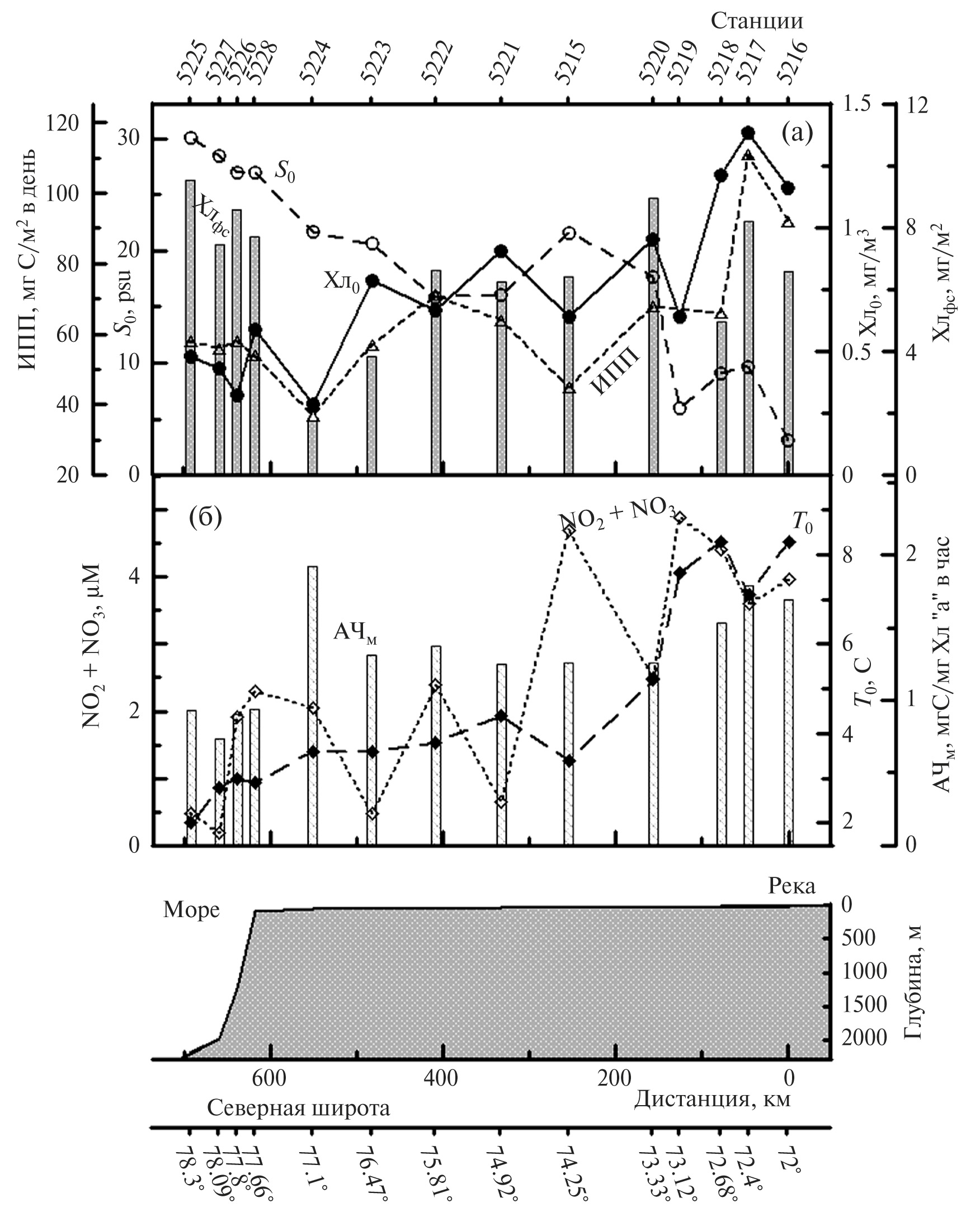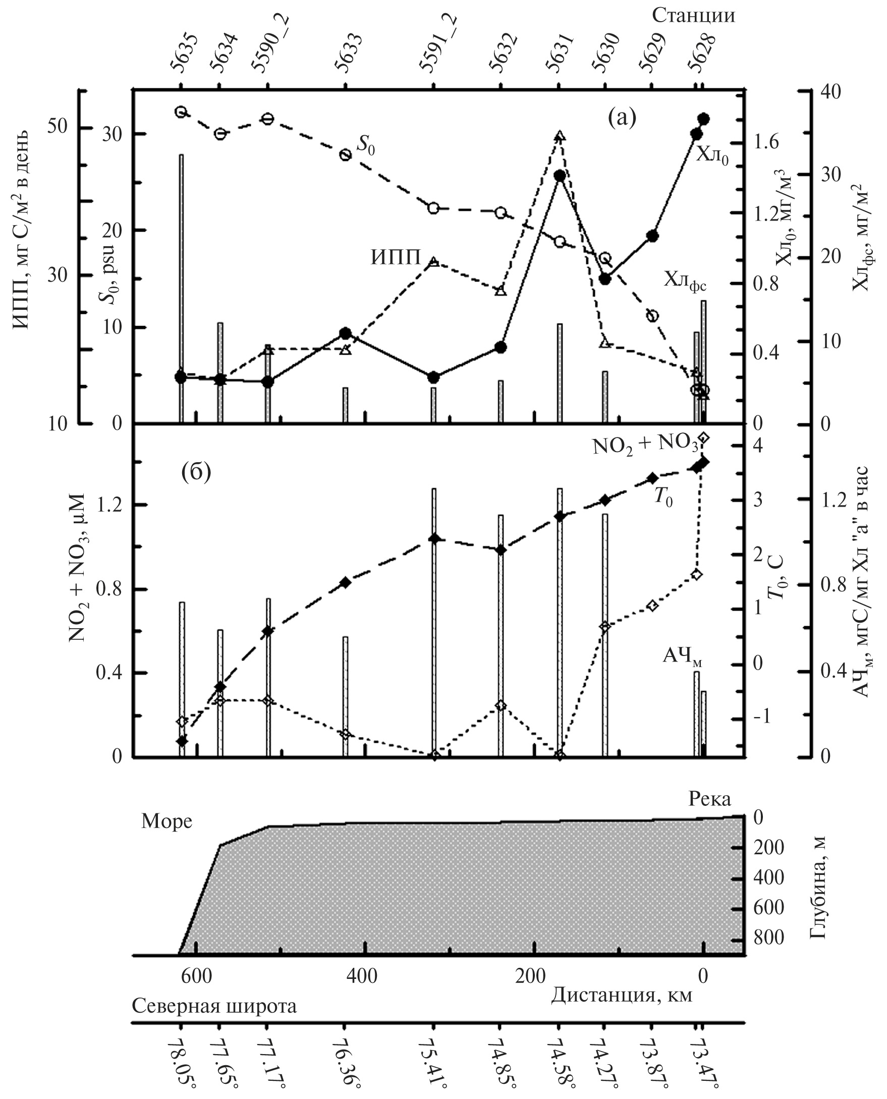 Для обоих рассматриваемых разрезов характерно увеличение продукционных показателей в области континентального склона (рис. 2а и 3а). Особенно это увеличение заметно на разрезе “Лена” и для величин Хлфс на разрезе “Хатанга”. Одной из причин возрастания интегральных значений первичной продукции и содержания хл “а” является увеличение слоя фотосинтеза при одновременном росте прозрачности воды вследствие ослабления влияния речного стока у границы шельфа и за его пределами. Так, на разрезе “Лена” средняя прозрачность по диску Секки на станциях, выполненных над континентальным склоном, возросла в 5.5 раза, а толщина слоя фотосинтеза увеличилась в 2 раза. На разрезе “Хатанга” аналогичные изменения составили 2.3 и 2.6 раза соответственно. Другой причиной служит образование глубинных хлорофильных максимумов (ГХМ). Следует отметить, что ГХМ были зарегистрированы в районе континентального склона только на разрезе “Хатанга”. Здесь на станциях 5590_2, 5634 и 5635 на глубинах 24–27 м содержание хл “а” в 1.7–3.6 раза превышало величины Хл0.