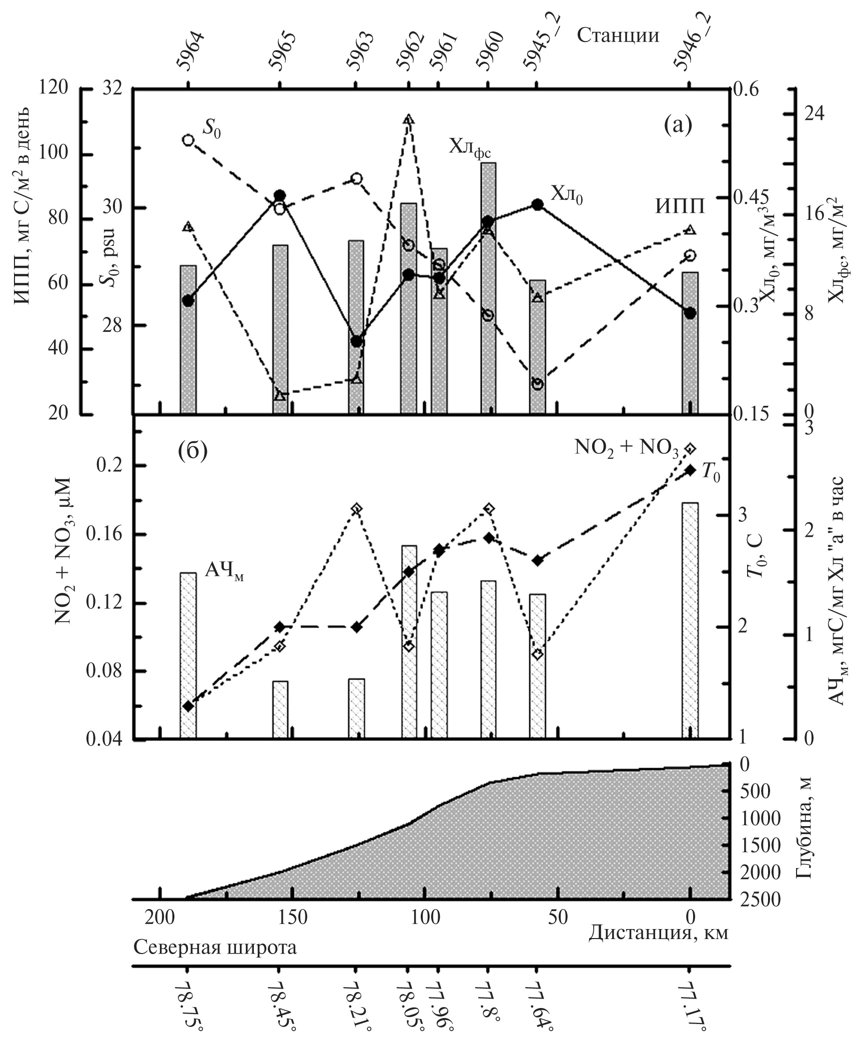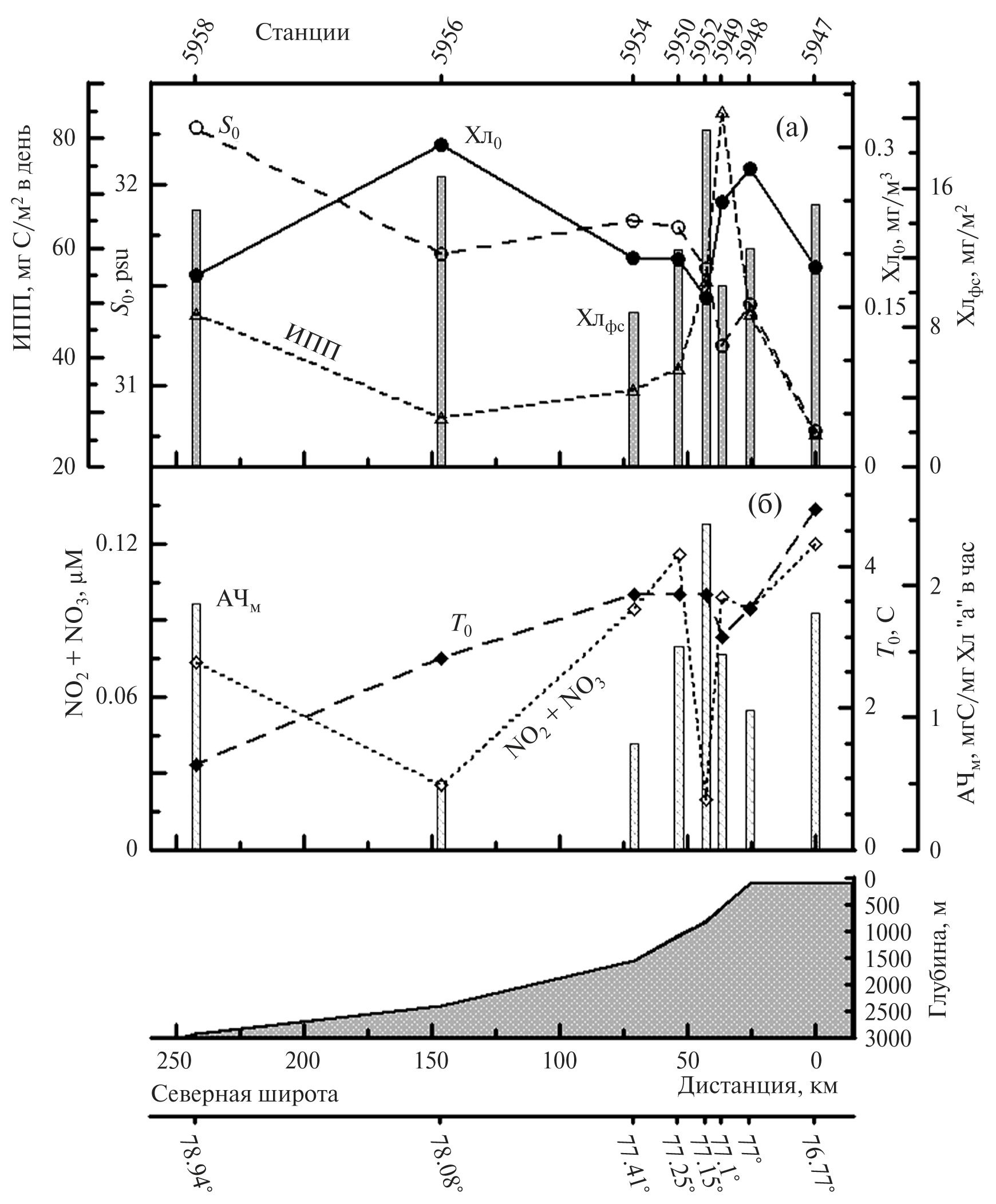 Величина АЧм на разрезе “Западный склон” изменялась в 4 раза — от 0.56 до 2.26 мгС/мг хл “а” в час, составив в среднем 1.39±0.58 мгС/мг хл “а” в час. Повышенные значения АЧм (> 1.5 мгС/мг хл “а” в час) рассчитаны для южных станций разреза, в точке с максимумом ИПП и на крайней северной станции (рис. 5б). Концентрация суммы нитритного и нитратного азота на разрезе была ниже лимитирующих значений на всех станциях (табл. 4). Аммонийный азот мог быть дополнительным источником минерального питания на станциях 5945_2, 5961 и 5965, где его концентрация превышала 0.6 µM. Концентрация растворенного кремния была выше лимитирующих значений только на шельфе и в начале континентального склона (табл. 4).