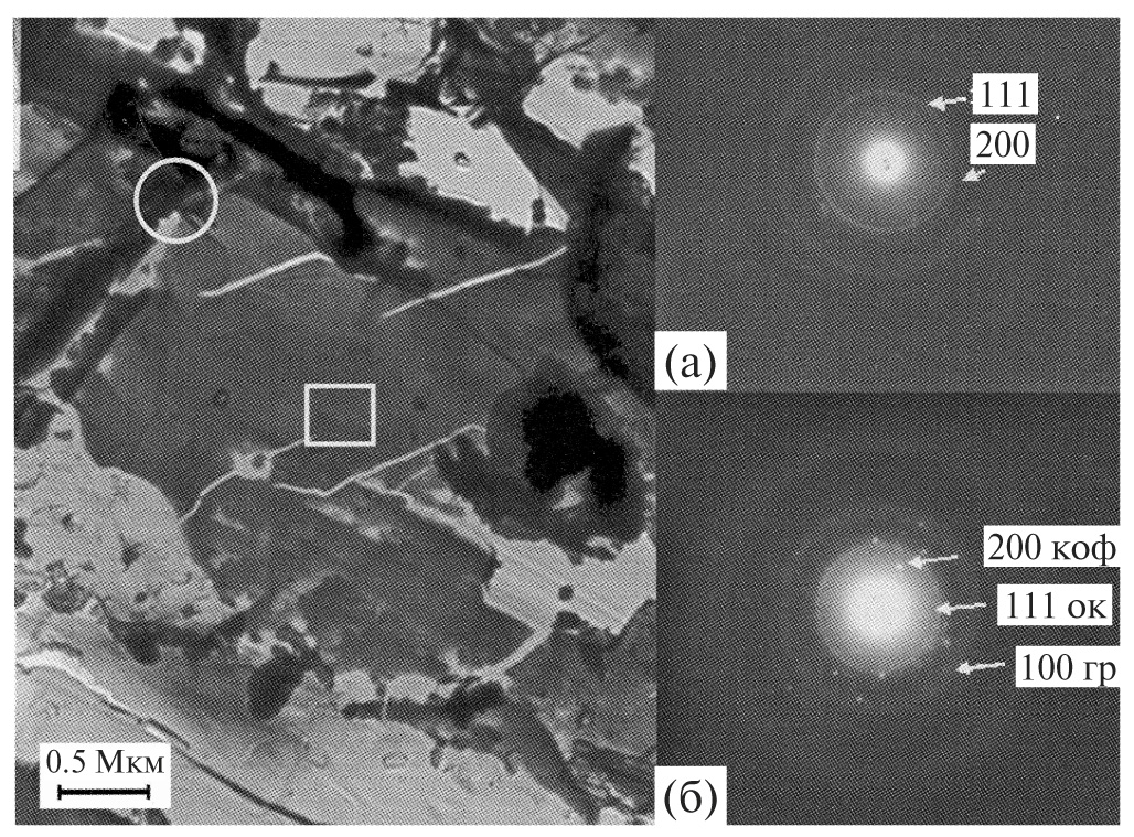Обломок кости, на котором образовалась пленка уранинита (квадрат); полость у верхнего края обломка (круг) заполнена многофазным материалом, включая коффинит (коф), уранинит (ок) и графит (гр); (а) и (б) — соответствующие микродифракционные картины (МДК). Просвечивающий электронный микроскоп.