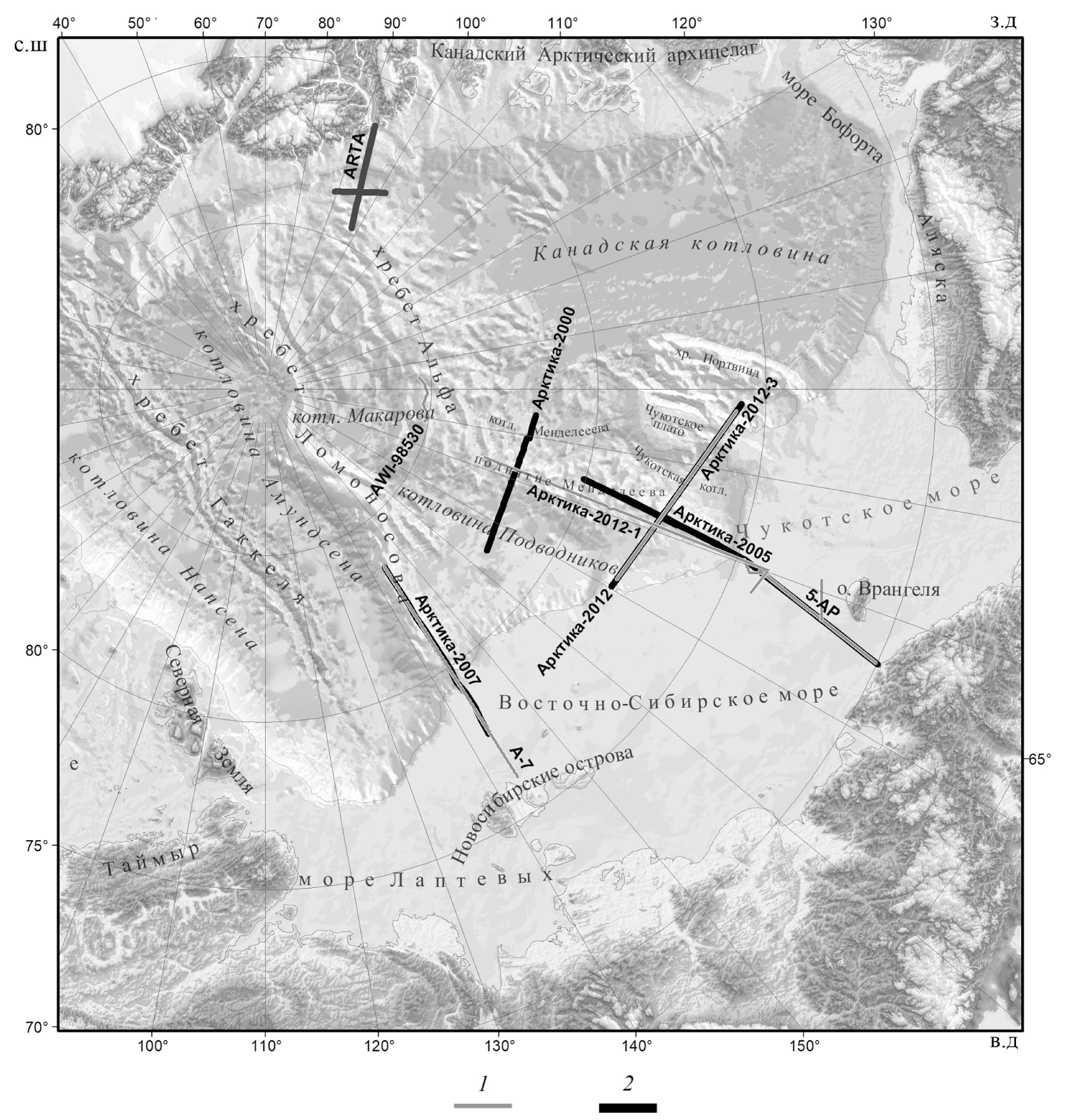 Объединенный профиль МОВ-ОГТ «5-АР — Арктика-2012_1» общей длиной 1400 км протянулся от побережья Чукотки через шельф Восточно-Сибирского моря и далее вдоль простирания поднятия Менделеева (рис. 8).