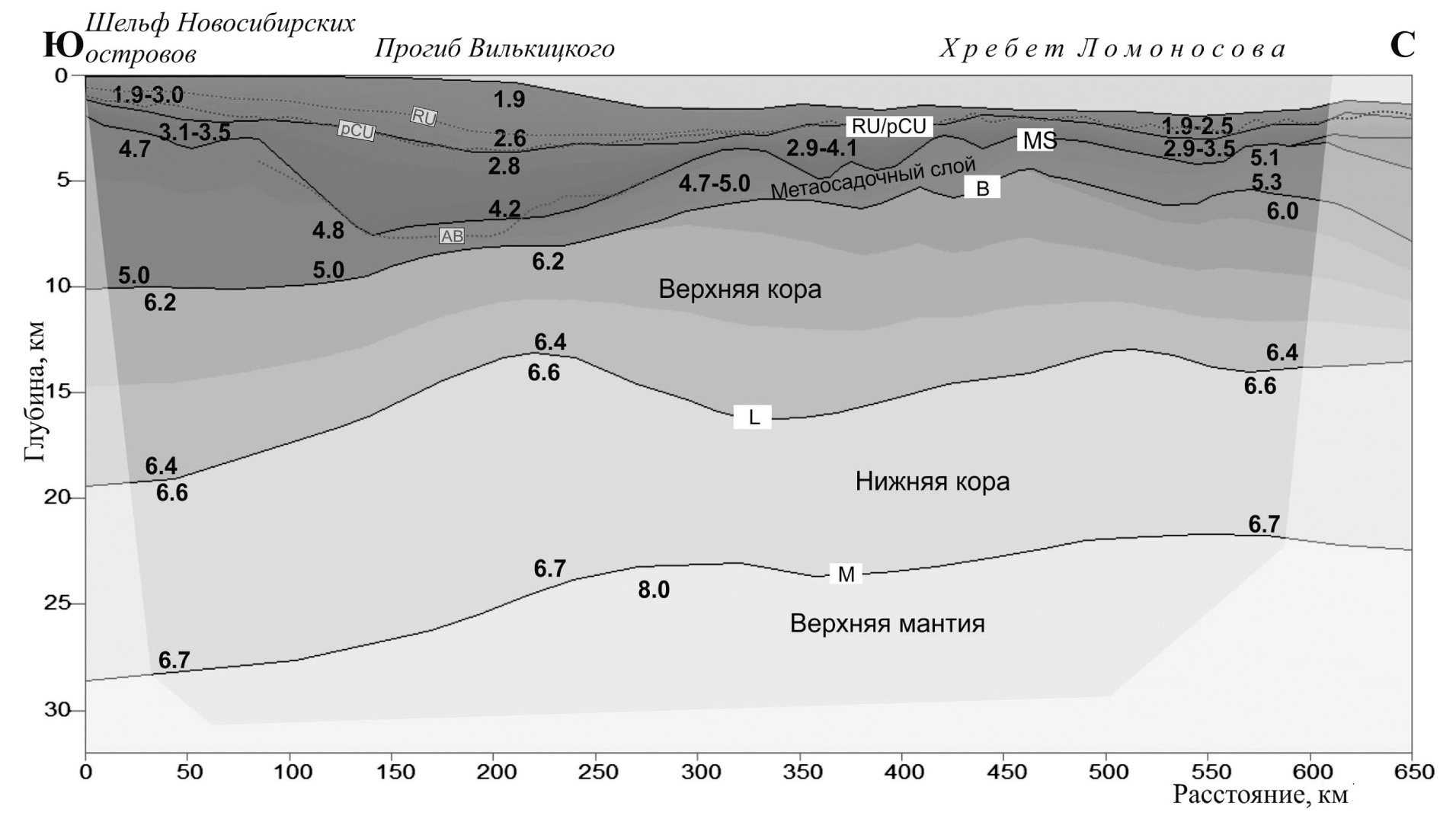 На скоростной модели земной коры вдоль профиля «Арктика-2007» прослежены два осадочных комплекса, разделенных несогласием. Верхний комплекс характеризуется скоростями от 1.9–2.6 км/с на шельфе и до 1.9–2.5 км/с на хребте Ломоносова; нижний — скоростями от 3.1–3.5 км/с на шельфе, 2.8–4.2 км/с в прогибе Вилькицкого и до 2.6–3.8 км/с на хребте Ломоносова. Суммарная мощность комплексов достигает максимума ~7 км в депоцентре прогиба Вилькицкого, на хребте Ломоносова она не превышает ~3 км [14, 34] (рис. 2).