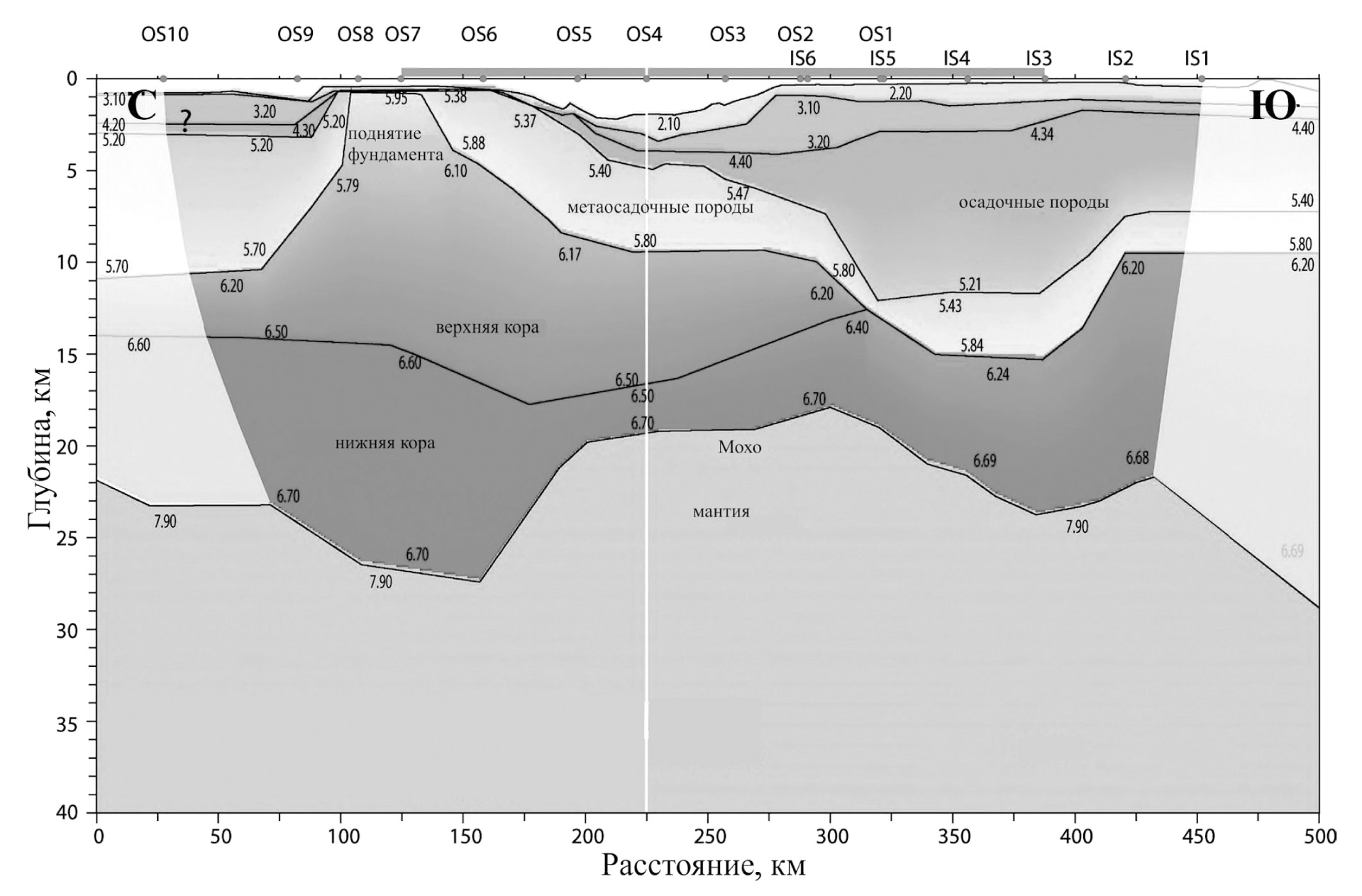 Рис. 7. Скоростная модель земной коры вдоль профиля ГСЗ «Арктика-2000» [13].