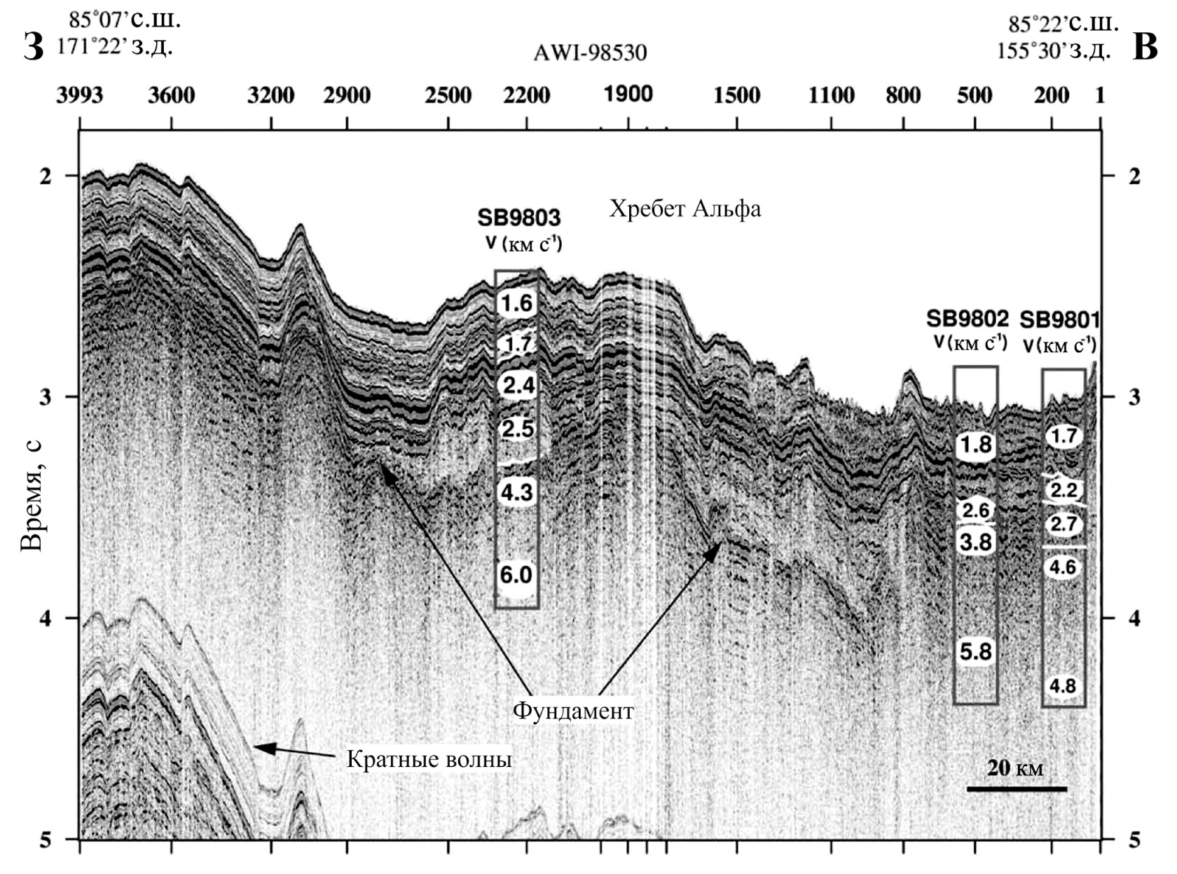 Рис. 5. Сейсмический разрез по профилю МОВ-ОГТ AWI-98530 в западной части хребта Альфа со скоростными колонками сейсмических зондирований МОВ-МПВ [31].