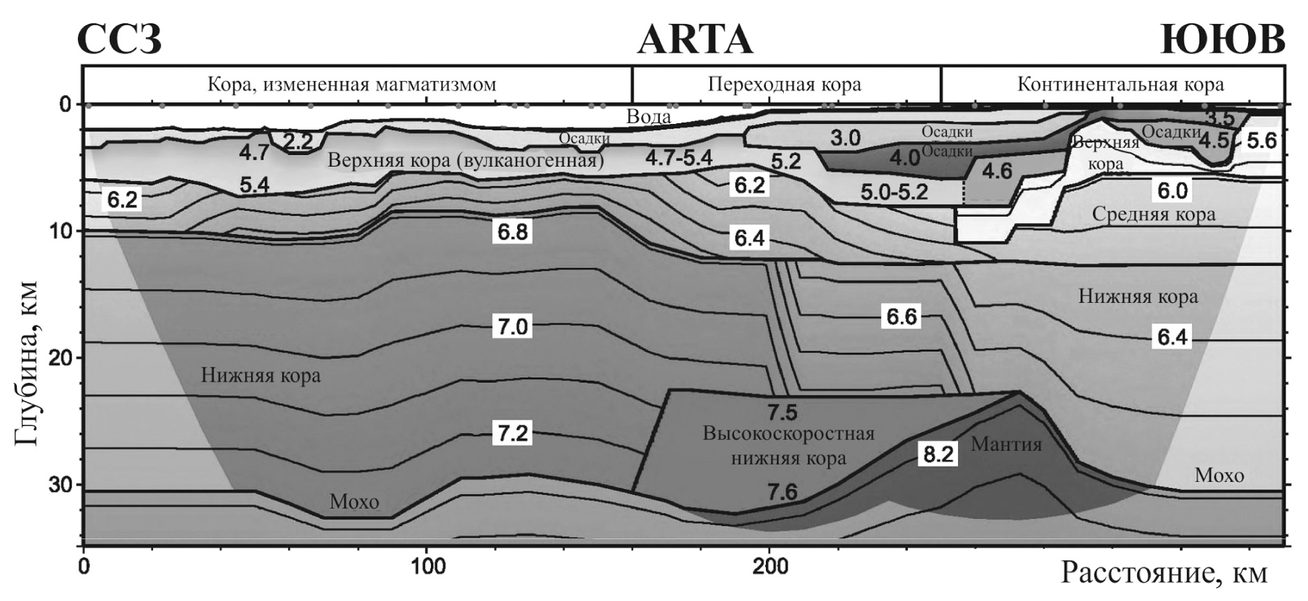 Рис. 6. Скоростная модель земной коры хребта Альфа группы ARTA [25].