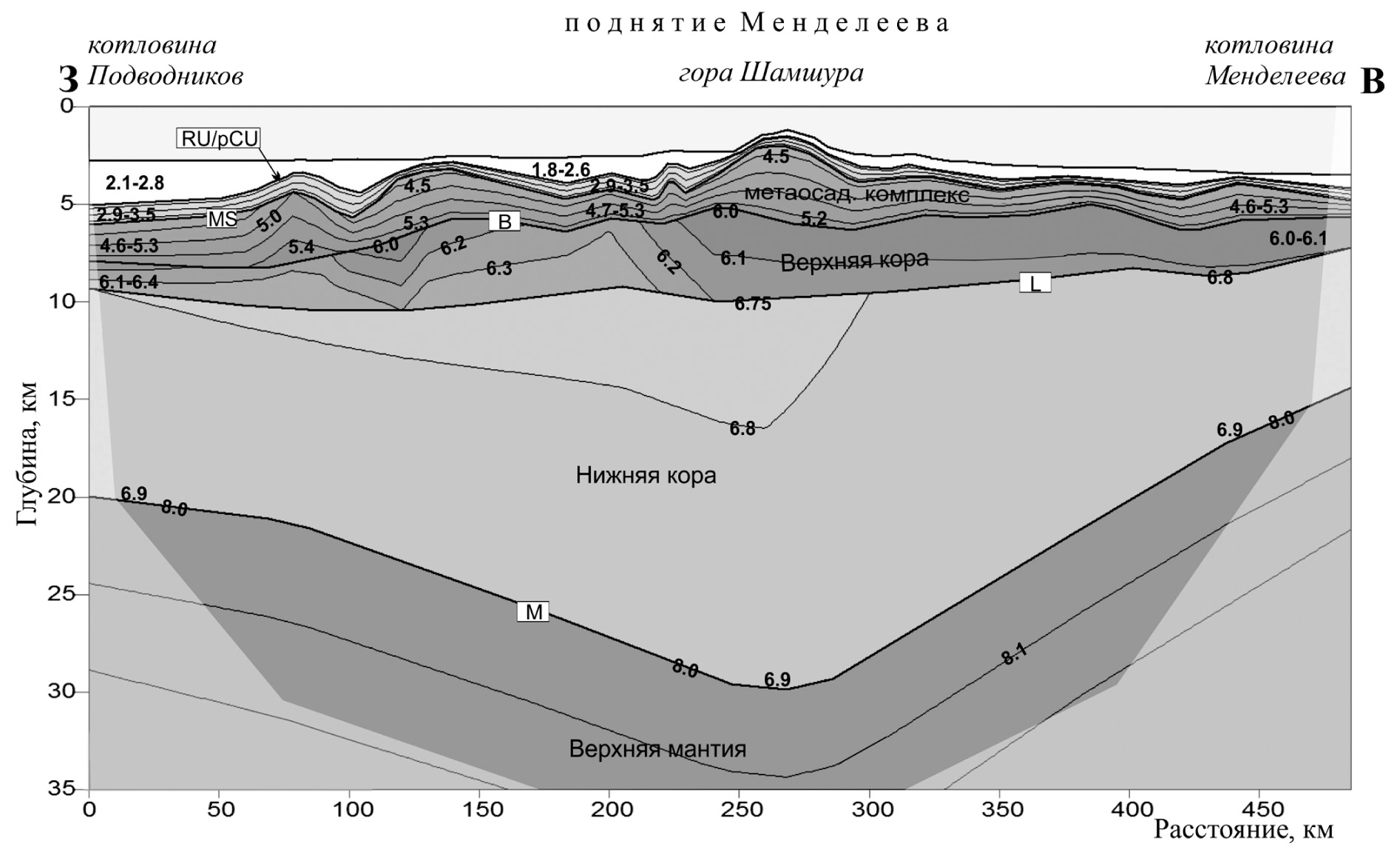 На модели прослежены (рис. 7) два осадочных комплекса, разделенных региональным несогласием (RU+pCU). Они характеризуются скоростями от 1.8–2.6 км/с до 2.1–2.8 км/с (верхний) и 2.9–3.5 км/с (нижний). Суммарная мощность комплексов достигает максимума в ~3.5 км в котловине Подводников, в осевой части поднятия Менделеева (гора Шамшура) она уменьшается до ~0.5 км. Метаосадочный комплекс характеризуется значениями скорости 4.5–5.3 км/с. Мощность комплекса варьирует в широком диапазоне от 1 до 4 км, достигая максимальных значений под горой Шамшура. В верхней коре скорость варьирует от 6.0–6.1 км/с до 6.3–6.4 км/с. Мощность верхней коры на поднятии Менделеева составляет 4–5 км, под котловиной Подводников она уменьшается до ~1.5 км, под котловиной Менделеева — до ~2 км. Скоростные параметры нижней коры изменяются в пределах 6.7–6.9 км/с. Мощность нижней коры составляет ~20 км под осевой частью поднятия Менделеева, уменьшается до ~10 км в котловине Подводников и до ~7 км в котловине Менделеева. Мощность кристаллической коры на поднятии Менделеева достигает 24 км, уменьшаясь до 10–12 км в прилегающих бассейнах.