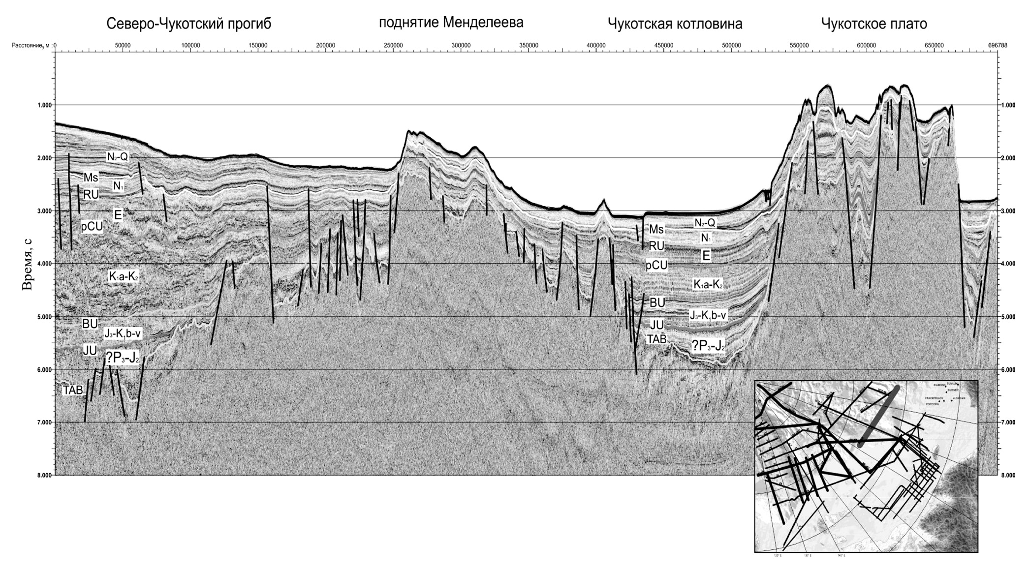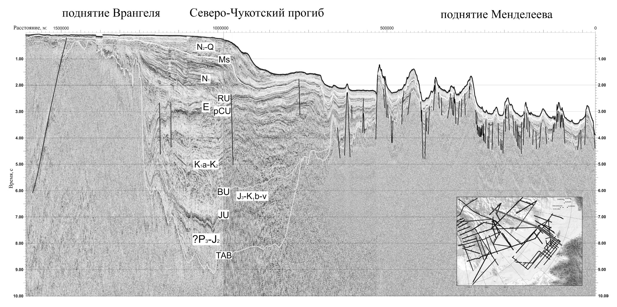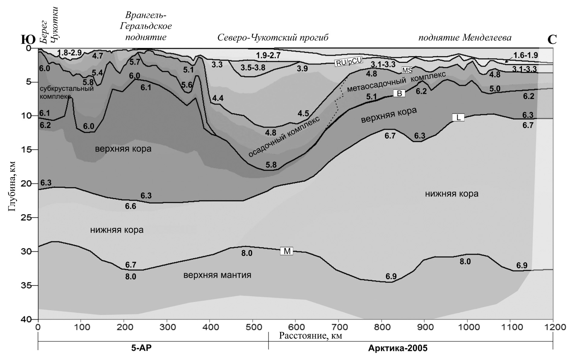 Два осадочных комплекса, разделенные несогласием (RU+pCU), отчетливо прослеживаются с поднятия Менделеева в Северо-Чукотский прогиб. Сейсмические скорости обоих комплексов возрастают в сторону Северо-Чукотского прогиба от 1.6–1.9 км/с и 3.1–3.3 км/с до 1.8–2.5 км/с и 3.9–4.4 км/с соответственно. Суммарная мощность комплексов достигает максимума ~12 км в депоцентре Северо-Чукотского прогиба, на поднятии Менделеева она не превышает ~2.5 км. Метаосадочный слой, выделенный на поднятии Менделеева, сменяется в Северо-Чукотском прогибе стратифицированными осадочными комплексами мощностью свыше 4 км при скорости 4.7–5.8 км/с (рис. 9). Мощность метаосадочного слоя на поднятии Менделеева равна 2–3 км при скорости 4.8–5.1 км/с. Скорость в верхней коре меняется от 6.1–6.3 км/с в Северо-Чукотском прогибе до 6.2–6.3 км/с на поднятии Менделеева. Мощность верхней коры сокращается до 2–3 км под Северо-Чукотским прогибом, на поднятии Менделеева она варьирует в диапазоне 4–7 км.
