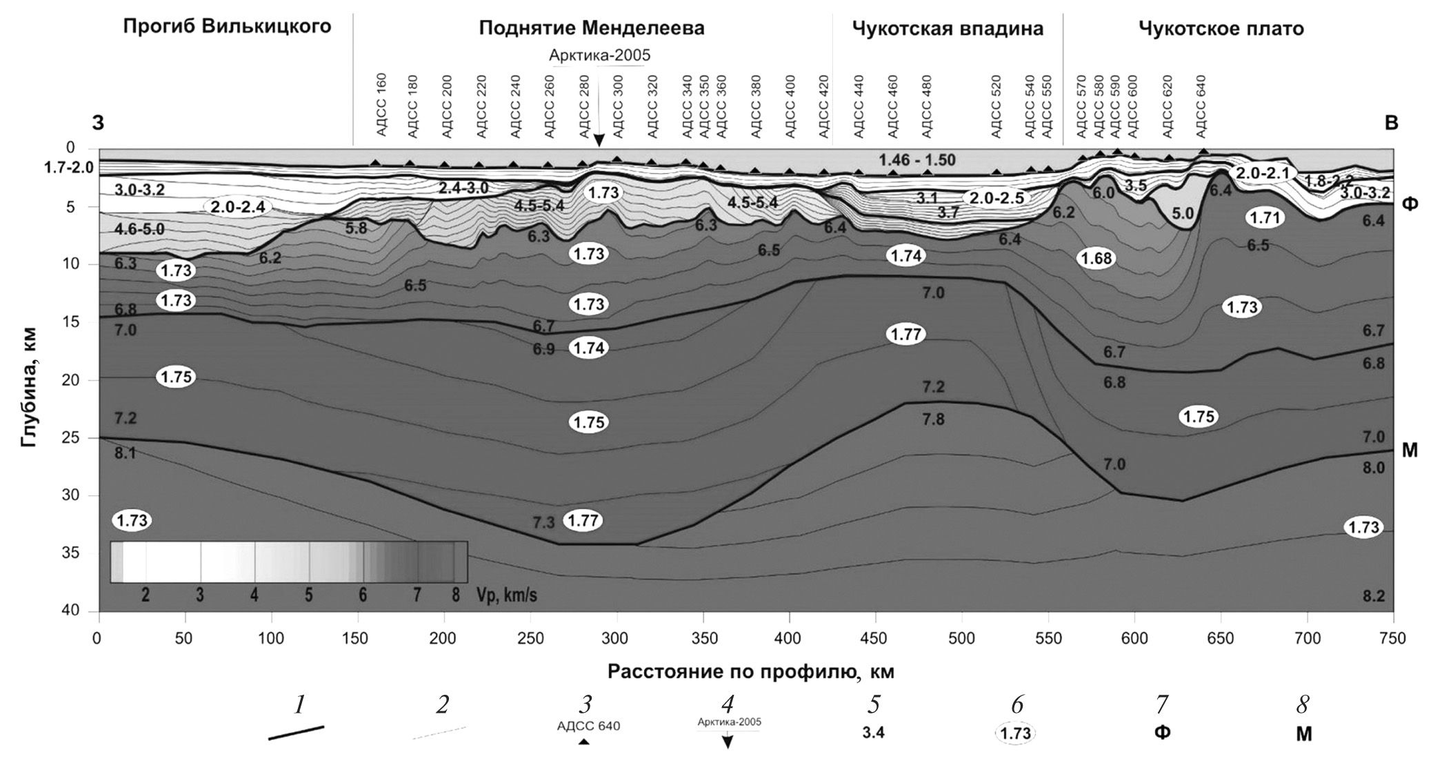 1 — сейсмические границы; 2 — изолинии скорости; 3 — автономные донные сейсмические станции (АДСС) и их номера; 4 — пересечение с профилем ГСЗ «Арктика-2005»; 5 — значения скорости продольных волн; 6 — значения отношения Vp/Vs; 7 — подошва осадочного чехла; 8 — подошва земной коры.
