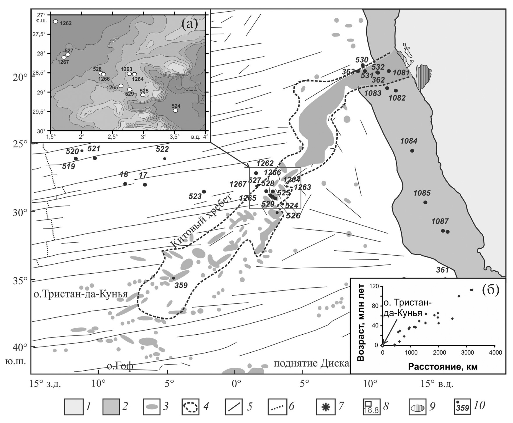 1 — Африканский континент; 2 — область шельфа и континентального склона; 3 — вулканотектонические поднятия, хребты и отдельные вулканические постройки; 4 — граница подножия Китового хребта; 5 — линеаменты (преимущественно трансформные разломы); 6 — ось САХ; 7 — острова; 8 — точки с известным абсолютным возрастом вулканических пород (млн лет), показаны цифрами; 9 — вулканиты провинция Этендека; 10 — скважины глубоководного бурения DSDP и ODP. Прямоугольником показана область рис. 3. Врезки: (а) — центральная часть Китового хребта, (б) — смена возраста пород фундамента Китового хребта в зависимости от расстояния до современной проекции плюма Тристан.