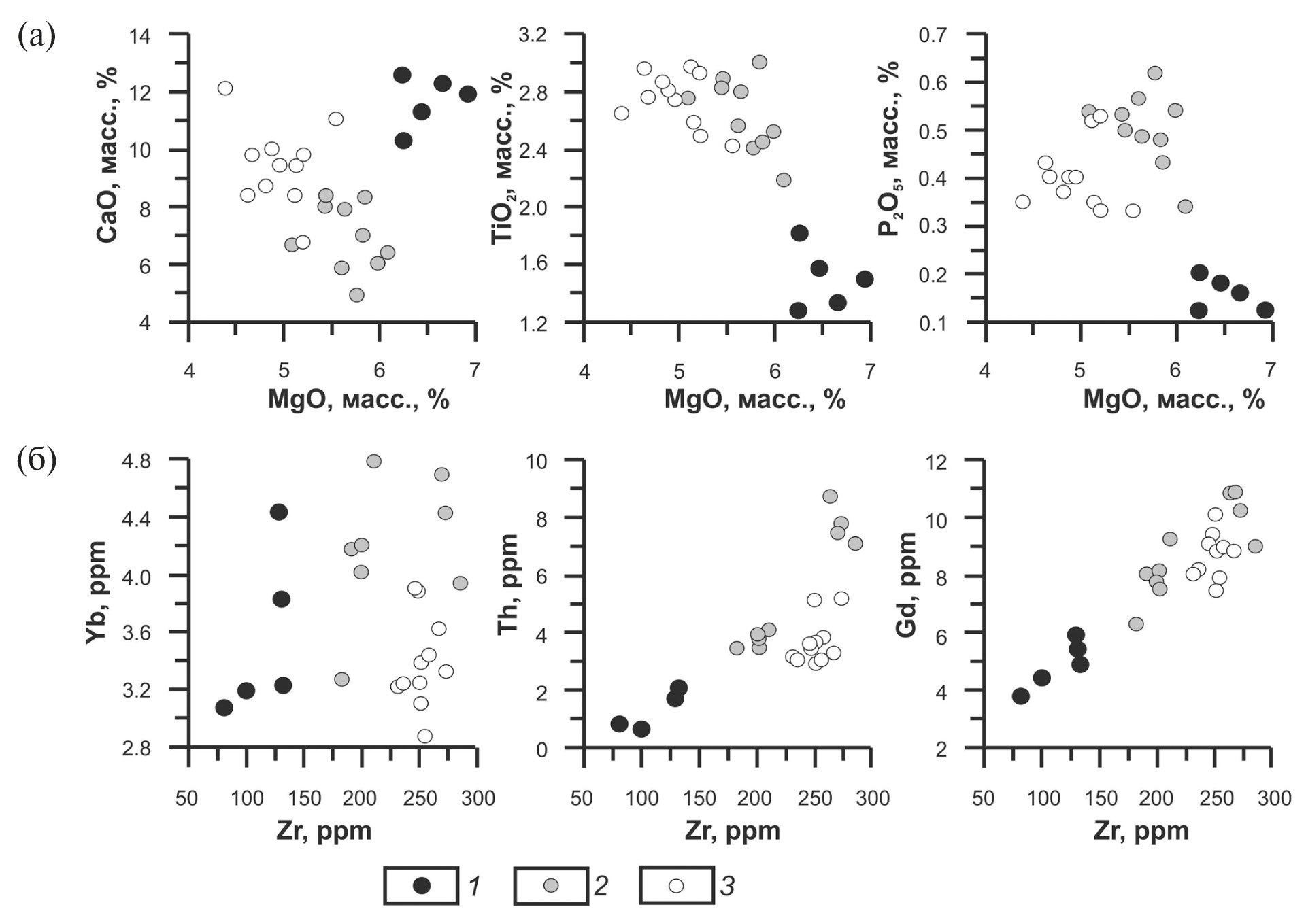 Оценка степени измененности базальтов Китового хребта освещена в работах [38, 50, 51, 53]. При допущении ограниченного влияния загрязнения проб осадочным веществом и относительно изохимическом характере постмагматических изменений (при слабой степени метаморфизма) сохранность первичного состава должна хорошо фиксироваться по корреляционным связям содержания Zr с главными элементами. На рис. 2 видно, что относительно слабая корреляция значений MgO с главными оксидами (рис. 2а) и Zr c высокозарядными элементами (рис. 2б), а также значительный разброс содержаний может говорить о возможном отклонении от первичного состава для базальтов хребта, в особенности это касается проб скв. 525.
