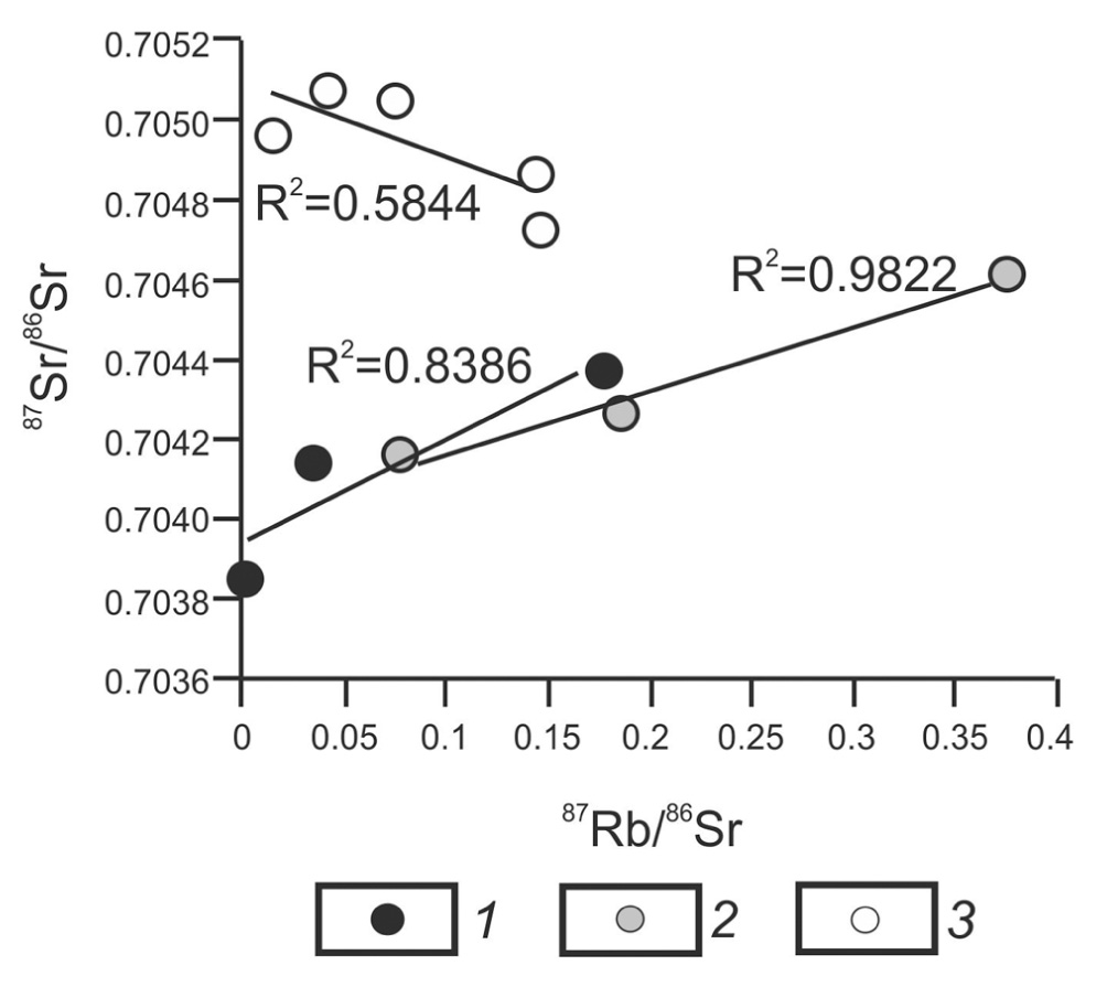 Соотношение изотопов 87Rb/ 86Sr в базальтах Китового хребта, определенное лишь для небольшого количества проб [50, 51], варьирует в широких пределах — от 0.001 до 0.376 (рис. 3). Распределение данных на изохронной диаграмме также показывает, что базальты скв. 525 имеют следы постмагматических изменений, включая, возможно, влияние на содержание изотопов Sr морской воды: характерно отсутствие прямой корреляции, отмечено повышенное соотношение изотопов 87Sr/ 86Sr (рис. 3). Степень измененности базальтов скважин 527, 528 гораздо ниже, коэффициент достоверности аппроксимации близок к 1. Таким образом, можно резюмировать: базальты хребта подверглись влиянию постмагматических процессов в разной степени, что затрудняет интерпретацию условий их образования.