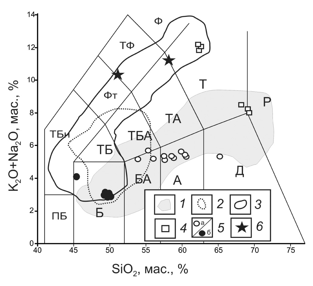 1–3 — поля вулканитов: 1 — вулканиты провинции Этендека (нижний-верхний мел), 2 — вулканиты центральной Китового хребта (скважины 525, 527, 528 (верхний мел-палеоцен)); 3 — вулканиты о. Тристан-Да-Кунья и о. Гофф (неоген-четвертичный); 4 — вулканический туф скв. 359 (поздний эоцен); 5 — вулканиты и вулканокласты восточной части Китового хребта (скв. 530): (а) — вулканические брекчии скв. 530 (нижний-средний миоцен), (б) — базальты (ранний мел); 6 — вулканиты, полученные драгированием в 15-м рейсе НИС «Академик Курчатов», западная часть Китового хребта. ПБ — пикрито-базальт, ТБн — тефробазанит, Тф — тефрит, Ф — фонолит, Б — базальт, ТБ — трахибазальт, БА — андезибазальт, ТБА — трахиандезибазальт, А — андезит, ТА — трахиандезит, Д — дацит, Т — трахит, Р — риолит.
