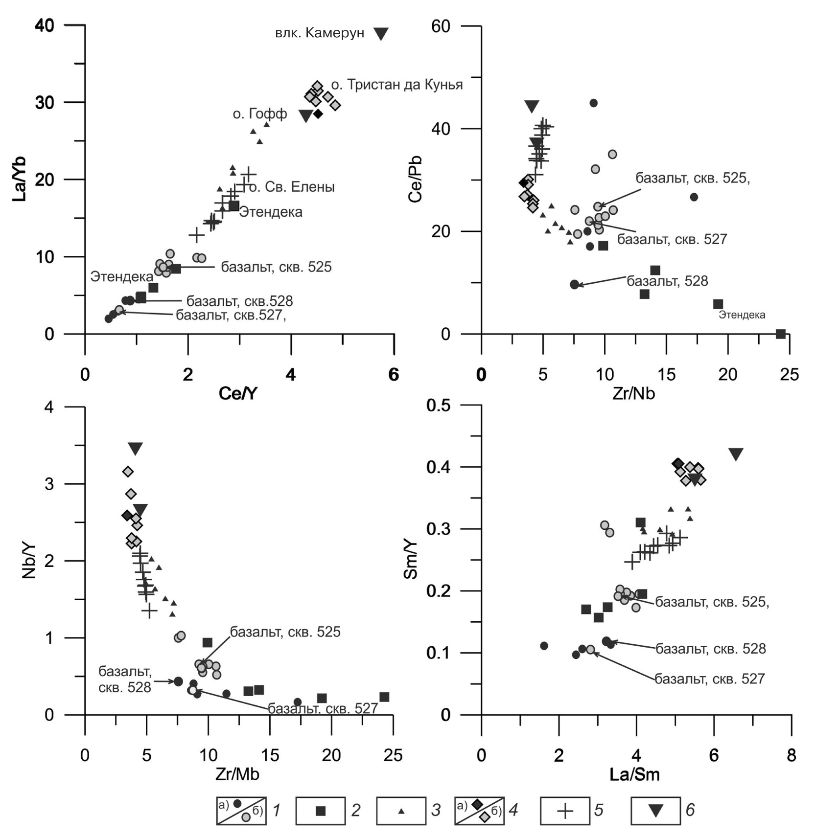 (а) — базальты скв. 527 (MgO>6%, Na2O+K2O<5%), (б) — базальты скв. 525 (MgO<6%, LOI (3.09–7.98%)); 2 — базальты провинции Этендека (MgO>6%, Na2O+K2O<5%, Cr>200 ppm); 3 — примитивные базальты о. Гофф; 4 — вулканиты о. Тристан-Да-Кунья: (а) — измененный базальт, (б) — базаниты; 5 — примитивные базальты, базаниты и пикробазальты о. Св. Елены; 6 — примитивные базальты влк. Камерун.
