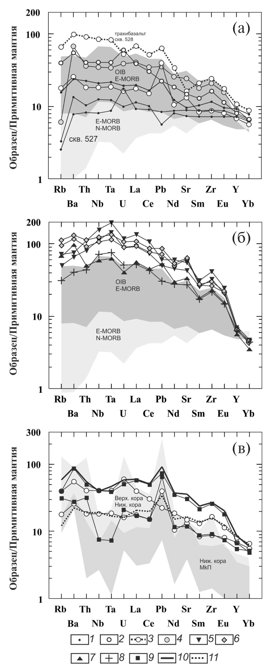 (а)– базальты Китового хребта, (б) — вулканиты островов и влк. Камерун, (в) — вулканиты континентальной обстановки. 1 — базальты скв. 527, 2 — базальт скв. 528, 3 — трахибазальт скв. 528, 4 — измененные базальты скв. 525, 5 — примитивные базальты влк. Камерун, 6 — базаниты о. Тристан-Да-Кунья, 7 — примитивные базальты о. Гофф, 8 — базальты о. Св. Елена, 9 — базальты провинции Этендека (Южная Африка),10 — базальты провинции Парана (Южная Америка), 11 — базальты возв. Рио-Гранде. Полями отмечены характерные геотектонические обстановки: океаническая: N-MORB-E-MORB, E-MORB-OIB; континентальная: нижняя кора — верхняя кора — МКП (Мега континентальный плюм).