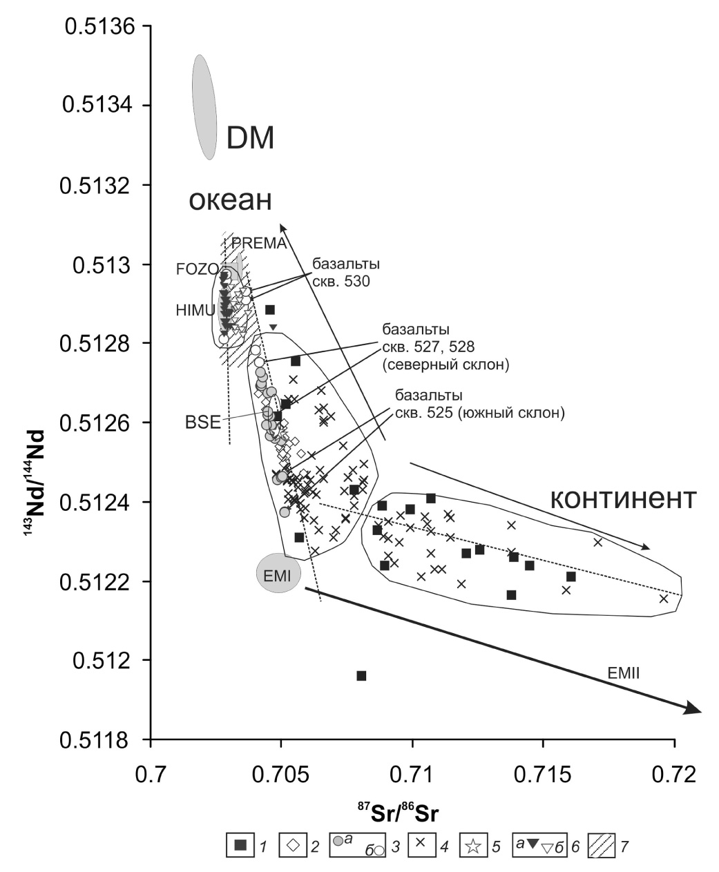 1 — базальты провинций Этендека (Южная Африка); 2 — базальты о. Тристан-Да-Кунья; 3 — базальты Китового хребта: (а) — базальты центральной части (скважины 525–528), (б) — базальты восточной части (530), 4 — базальты вулканической провинции Парана (Южная Америка), 5 — базальты возв. Рио-Гранде, 6 — базальты Камерунской вулканической линии: (а) — западная часть (о. Св. Елены), (б) — восточная часть (влк. Камерун, о. Пагалу), 7 — базальты САХ (11–19° ю. ш.).