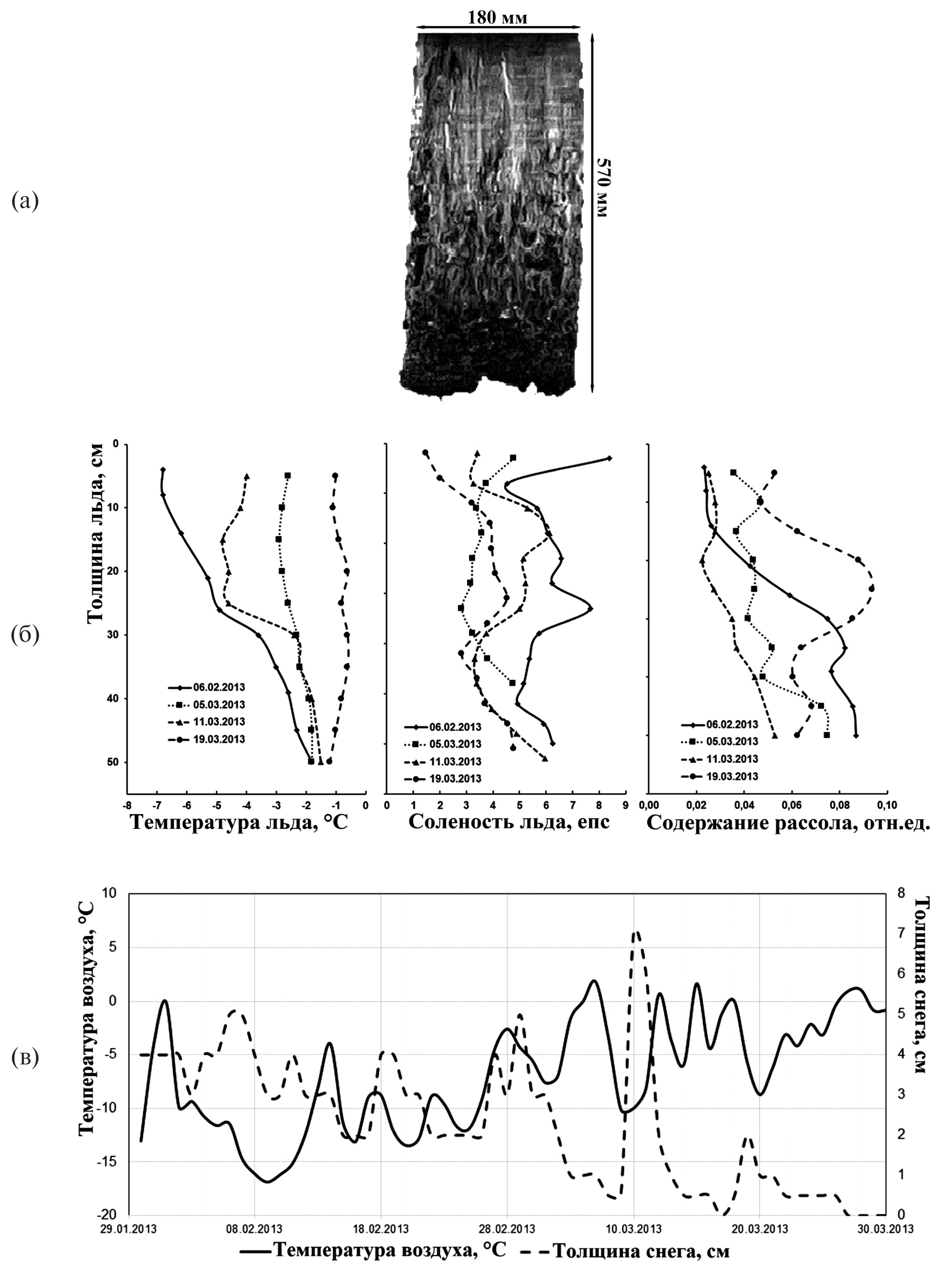 Рис. 2. (а) — МРТ керна льда, извлеченного 19.03.2013 г. (толщина льда 57 cм, толщина снежного покрова 2 см, температура воздуха -2°C); (б) — вертикальное распределение температуры, солености и содержания рассола в 2013 г.; (в) — изменения температуры воздуха и толщины снежного покрова в январе–марте 2013 г.