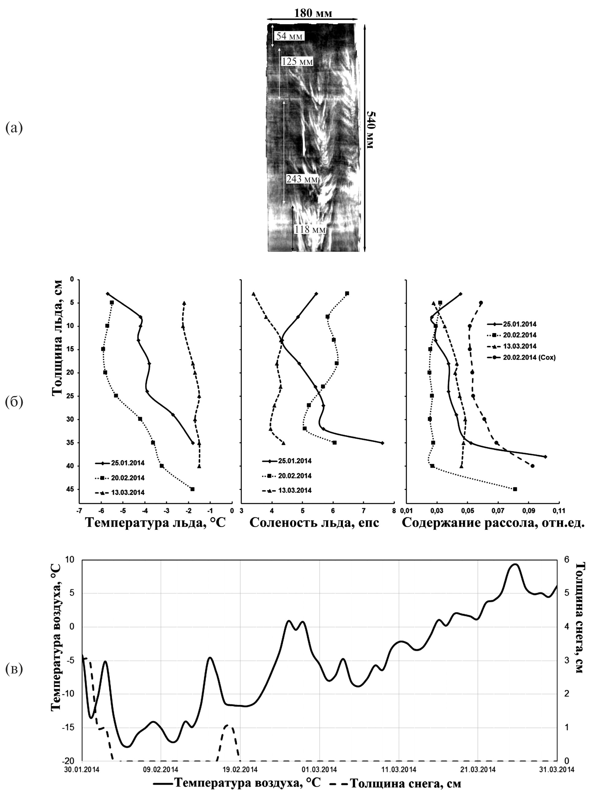 Рис. 3. (а) — МРТ керна льда, извлеченного 20.02.2014 г. (толщина льда 54 cм, толщина снежного покрова 0 см, температура воздуха -6°C); (б) — вертикальное распределение температуры, солености и содержания рассола в 2014 г. (Cox) — результаты вычислений по методу Cox & Weeks; (в) — изменения температуры воздуха и толщины снежного покрова в январе–марте 2014 г.