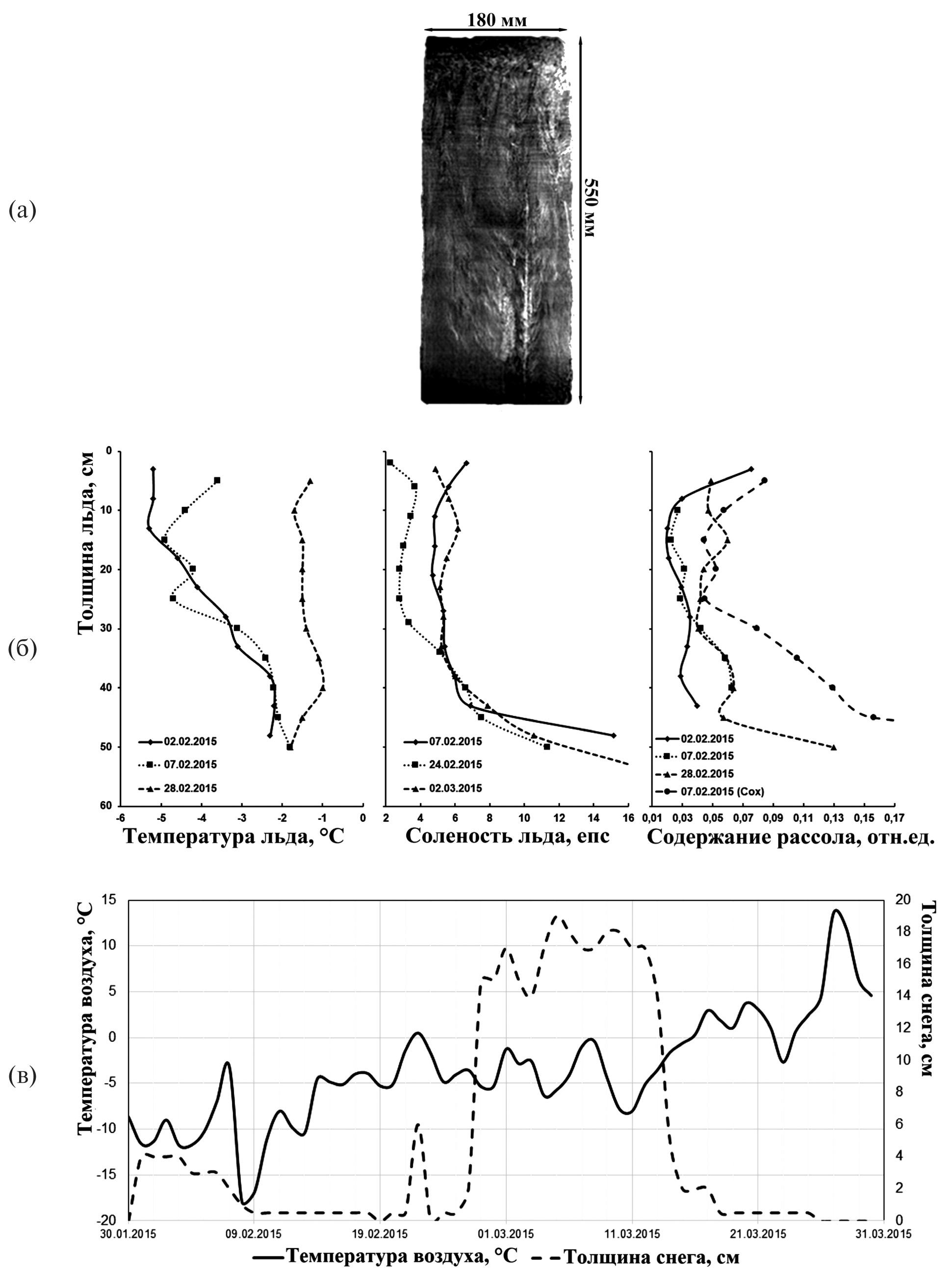 Рис. 4. (а) — МРТ керна льда, извлеченного 7.02.2015 г. (толщина льда 55 cм, снежного покрова 2 cм, температура воздуха -8°C); (б) — вертикальное распределение температуры, солености и содержания рассола в 2015 г. (Cox) — результаты вычислений по методу Cox & Weeks; (в) — изменения температуры воздуха и толщины снежного покрова в январе–марте 2015 г.