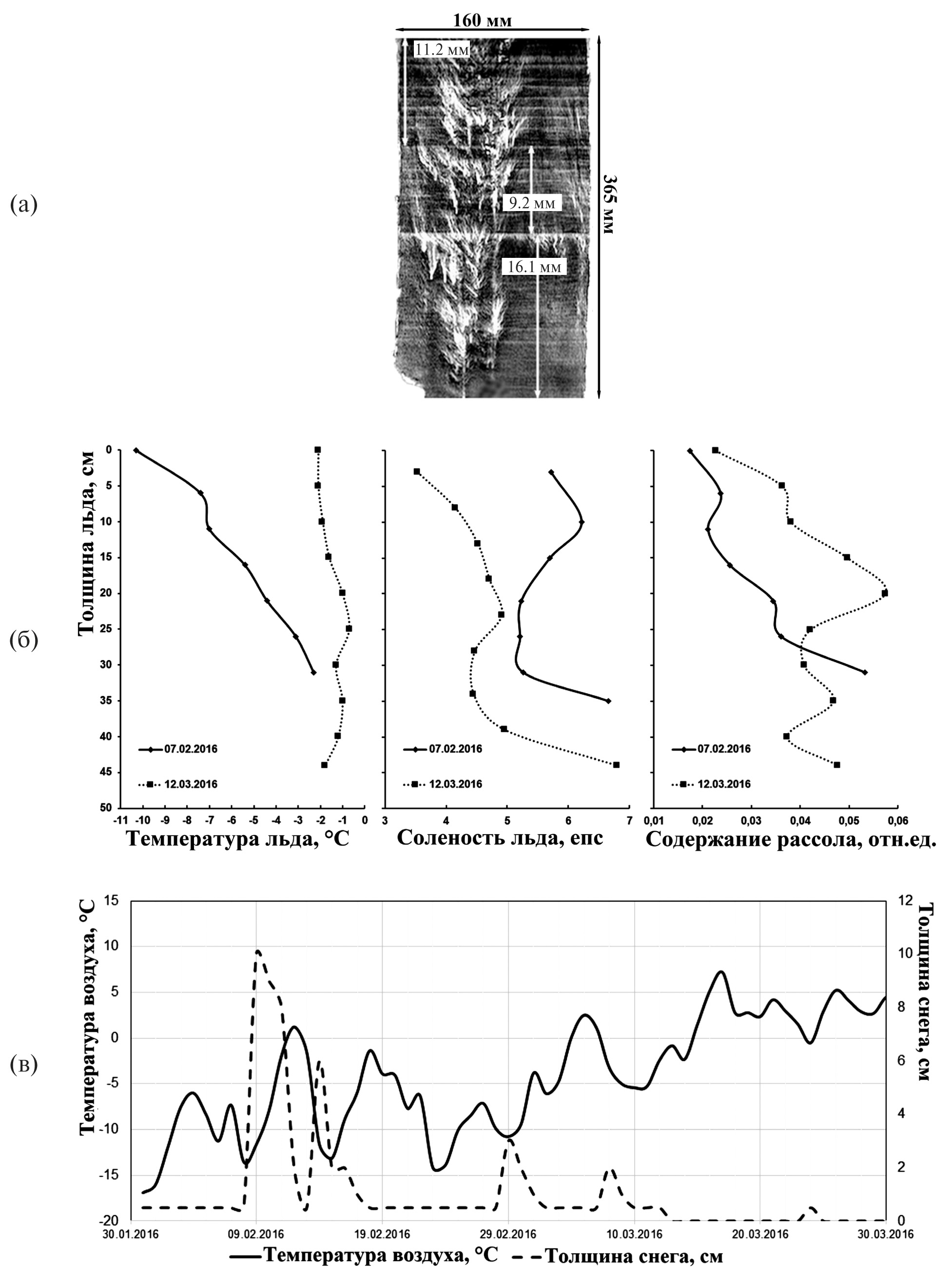 Рис. 5. (а) — МРТ керна льда, извлеченного 7.02. 2016 г. (толщина льда 36.5 cм, снежного покрова 0.5 cм, температура воздуха -9.1°C); (б) — вертикальное распределение температуры, солености и содержания рассола в 2016 г.; (в) — изменения температуры воздуха и толщины снежного покрова с конца декабря 2015 по март 2016 г.