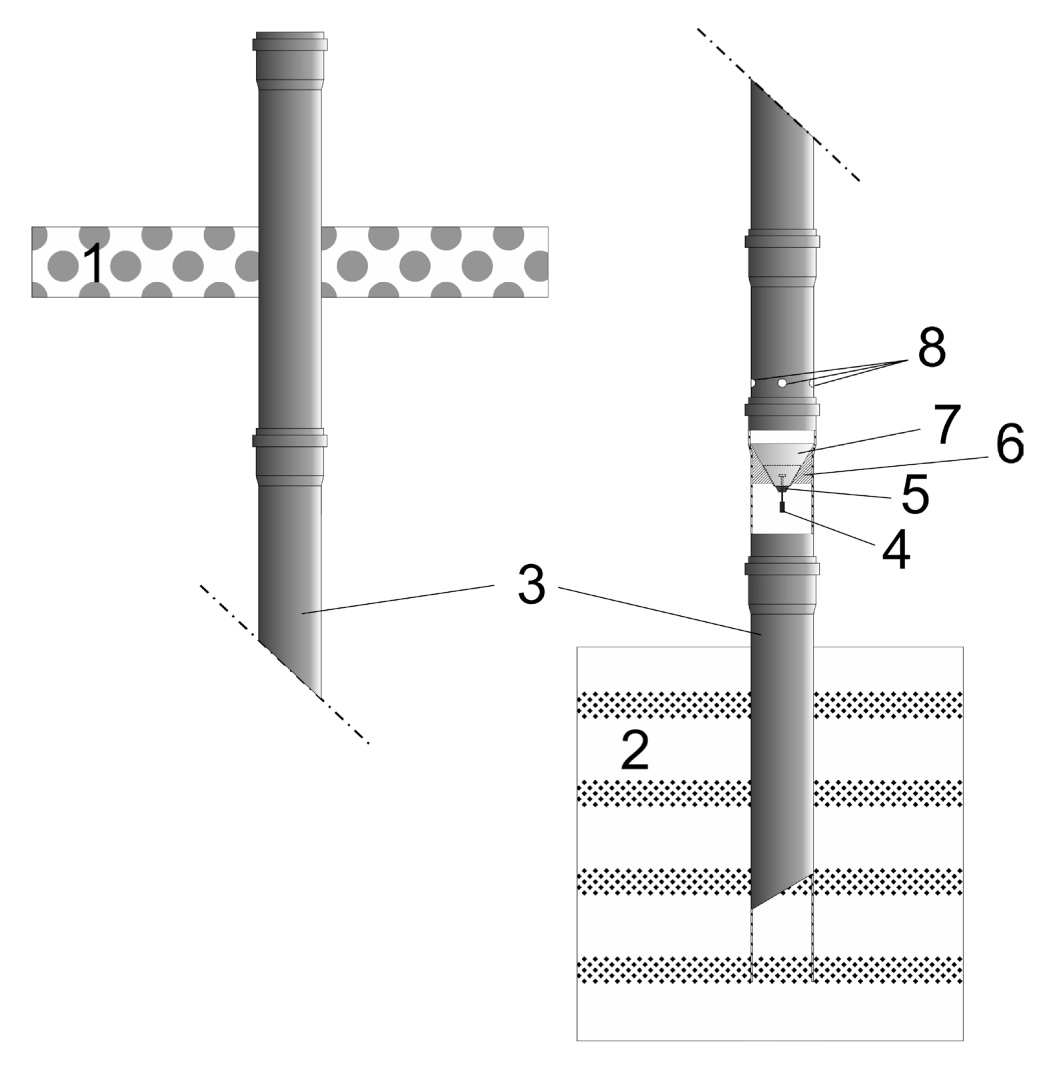 Рис. 1. Устройство буровой системы. 1 — лед, 2 — донный осадок, 3 — труба ПВХ (d = 75 мм), 4 — металлический груз, 5 — силиконовый конус, 6 — силиконовый герметик, 7 — пластиковая воронка, 8 — отверстия (4 шт., d = 7–10 мм).