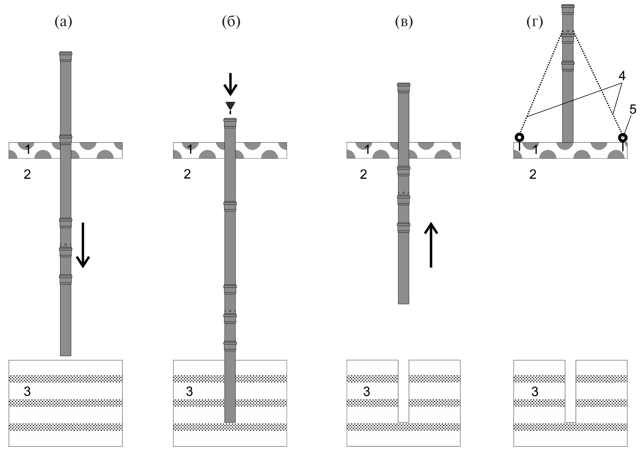Рис. 2. Технология бурения. (а) — Задавливание отборника в донный осадок; (б) — закрывание клапана: сброс конуса внутрь колонны из труб; (в) — подъем колонны; (г) — фиксация пробоотборника в вертикальном положении на льду при помощи тросов, замораживание керна. 1 — лед, 2 — вода, 3 — донный осадок, 4 — трос, 5 — ввертыш (шуруп с крюком).