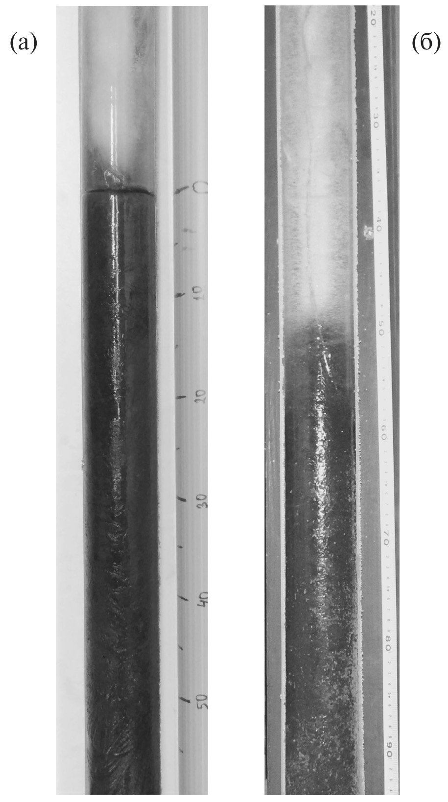 Рис. 4. Замороженные керны придонного осадка. (а) — Щекинское водохранилище, (б) — озеро Селигер. Фото автора.
