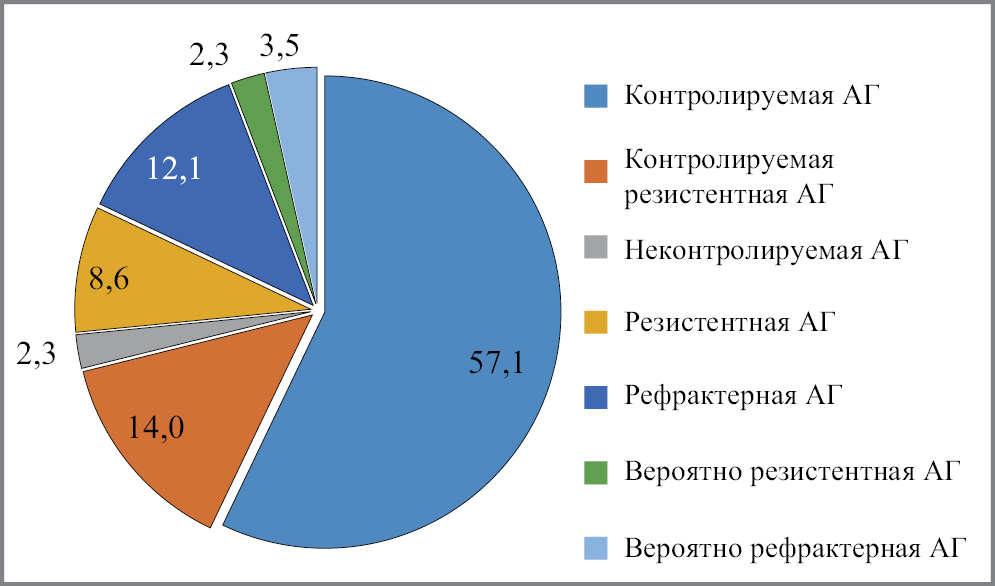 Из 256 больных к группе контролируемой АГ отнесены 146 (57%) больных, контролируемой резистентной АГ – 36 (14%) больных, неконтролируемой АГ – 6 (2,3%) больных, резистентной неконтролируемой АГ – 22 (8,6%) больных, рефрактерной АГ – 31 (12,1%) больной. К группе вероятно резистентной АГ отнесены 6 (3,5%) больных, вероятно рефрактерной АГ – 9 (3,5%) больных (рис. 1).