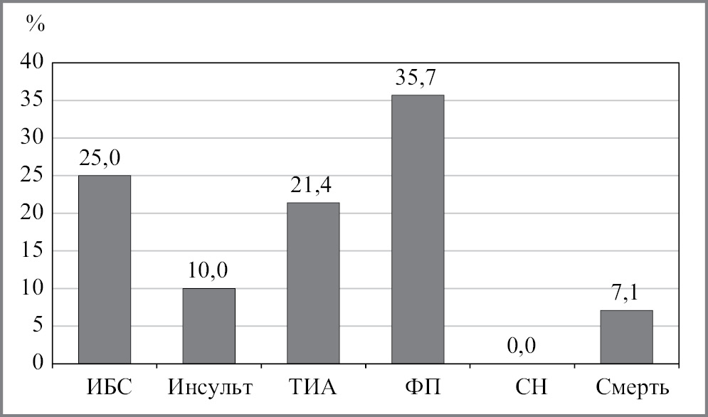 У всех пациентов проанализированы следующие осложнения, которые развились после выписки из стационара: возникновение ИБС (в том числе развитие ОИМ или проведение ТБКА в плановом порядке), наличие впервые установленных СН и ФП, а также развитие инсульта или ТИА. Всего у 28 (10,9%) больных из 256 произошло 28 осложнений, из них 7 (25%) относятся к ИБС (включая 3 ОИМ и 2 ТБКА), 3 (10%) инсульта, 6 (21,4%) эпизодов ТИА и 10 (35,7%) новых случаев ФП. Кроме того, у 2 (7,1%) больных развилась внезапная сердечная смерть (рис. 2). Случаев СН не выявлено.