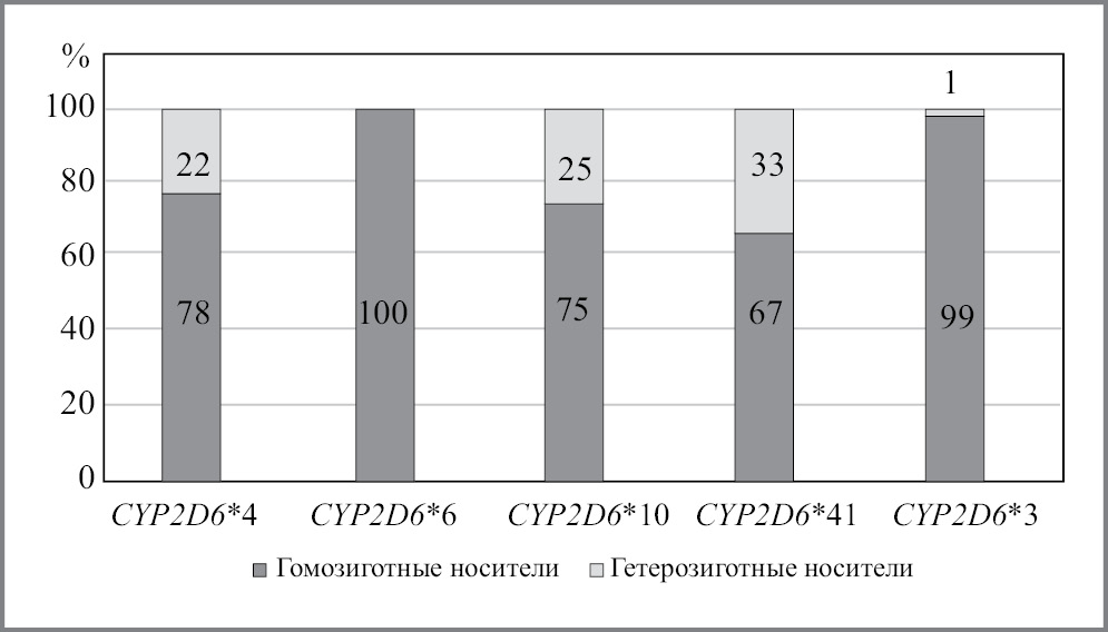 Венозную кровь пациентов собирали в первый день исследования в вакуумные пробирки с этилендиаминтетрауксусной кислотой IMPROVACUTER (Guangzhou Improve Medical Instruments Co., Ltd, Китай). Выделение геномной ДНК из цельной крови осуществлялось с помощью набора реагентов S-Сорб для выделения ДНК на кремниевом сорбенте (ООО «Синтол», Россия). Носительство полиморфных маркеров CYP2D6*4 (G1846A, rs3892097),CYP2D6*6 (T1707del, rs5030655), CYP2D6*10 (C100T, rs1065852), CYP2D6*41 (G2988A, rs28371725) и CYP2D6*3 (A2549del, rs4986774) выявлялось с помощью коммерческих наборов реагентов для определения соответствующих полиморфизмов (ООО «Синтол», Россия, TaqMan®SNP Genotyping Assays и TaqMan Universal Master Mix II, no UNG, Applied Biosystems, США) методом полимеразной цепной реакции в реальном времени на приборе CFX96 Touch Real Time System с ПО CFX Manager версии 3.0 (BioRad, США).