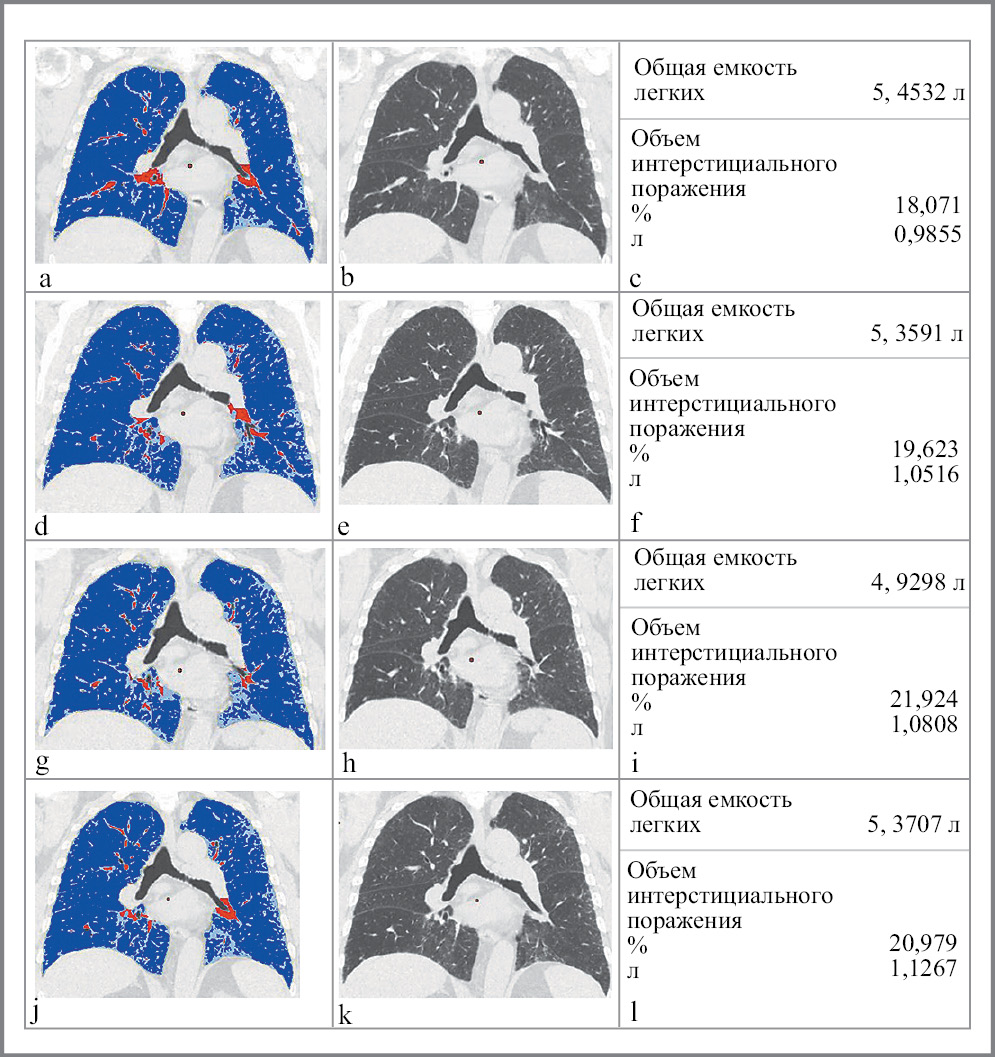 Рис. 1. Больной М., 65 лет. ИЛФ. КТ с оценкой объема поражения от 03.03.2020 – объем пораженной легочной ткани – 18,07%, что составляет 0,98 л из 5,45 л (общей емкости легких) (a, b, c). Контрольная КТ от 13.07.2020 – нарастание клинической симптоматики, увеличение объема пораженной легочной ткани – 19,62%, 1,05 л из 5,35 л (d, e, f). Контрольная КТ от 22.12.2020 – увеличение объема пораженной легочной ткани – 21,92%, 1,08 л из 4,92 л (g, h, i). Контрольная КТ от 09.06.2021 – стабилизация процесса на фоне терапии – 20,97%, 1,12 л из 5,37 л (j, k, l). В период с 03.2020 до 12.2020 отмечается снижение ДСЛ на 16% (с 70% ДСЛ до 54% ДСЛ).