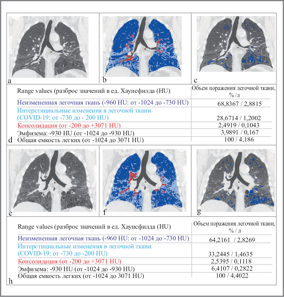Частое сочетание идиопатического легочного фиброза (ИЛФ) с хронической обструктивной болезнью легких, выявленное у 23 (30,6%) пациентов, и необходимость определения протяженности «сотового легкого» с крупным диаметром «сот», отмеченного у 42 (56%) больных, требовало применения сочетанного подсчета объема поражения легочной ткани с вычленением диапазона плотностей, используемых как для COVID-19-поражения легких, так и для кистозно-эмфизематозного поражения, позволяя точно оценить степень распространенности интерстициальных и кистозных изменений при ИЛФ. Клинический пример №2 изображен на рис. 2.