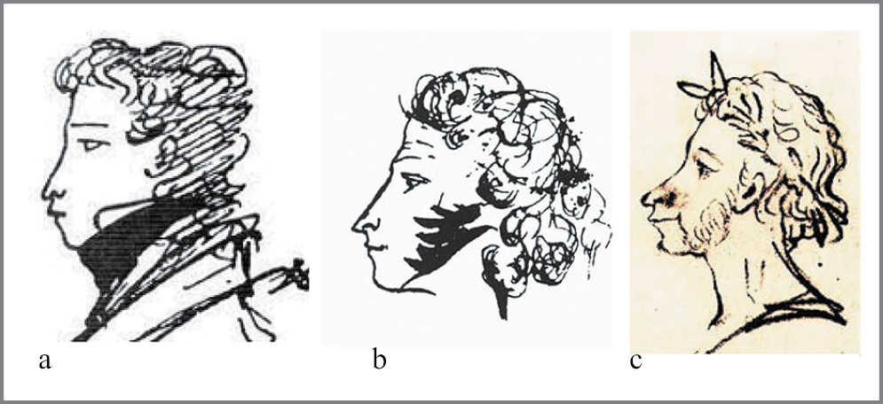 Рис. 3. Графические автопортреты Пушкина в разные периоды его жизни – старение и мудрость.