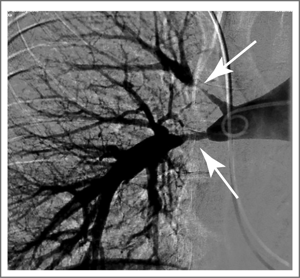 Рис. 1. Селективная ангиопульмонография у пациентки с АТ: субтотальный стеноз в устьях и проксимальных сегментах верхнедолевой и нижнедолевой ветвей правой легочной артерии (стрелки).