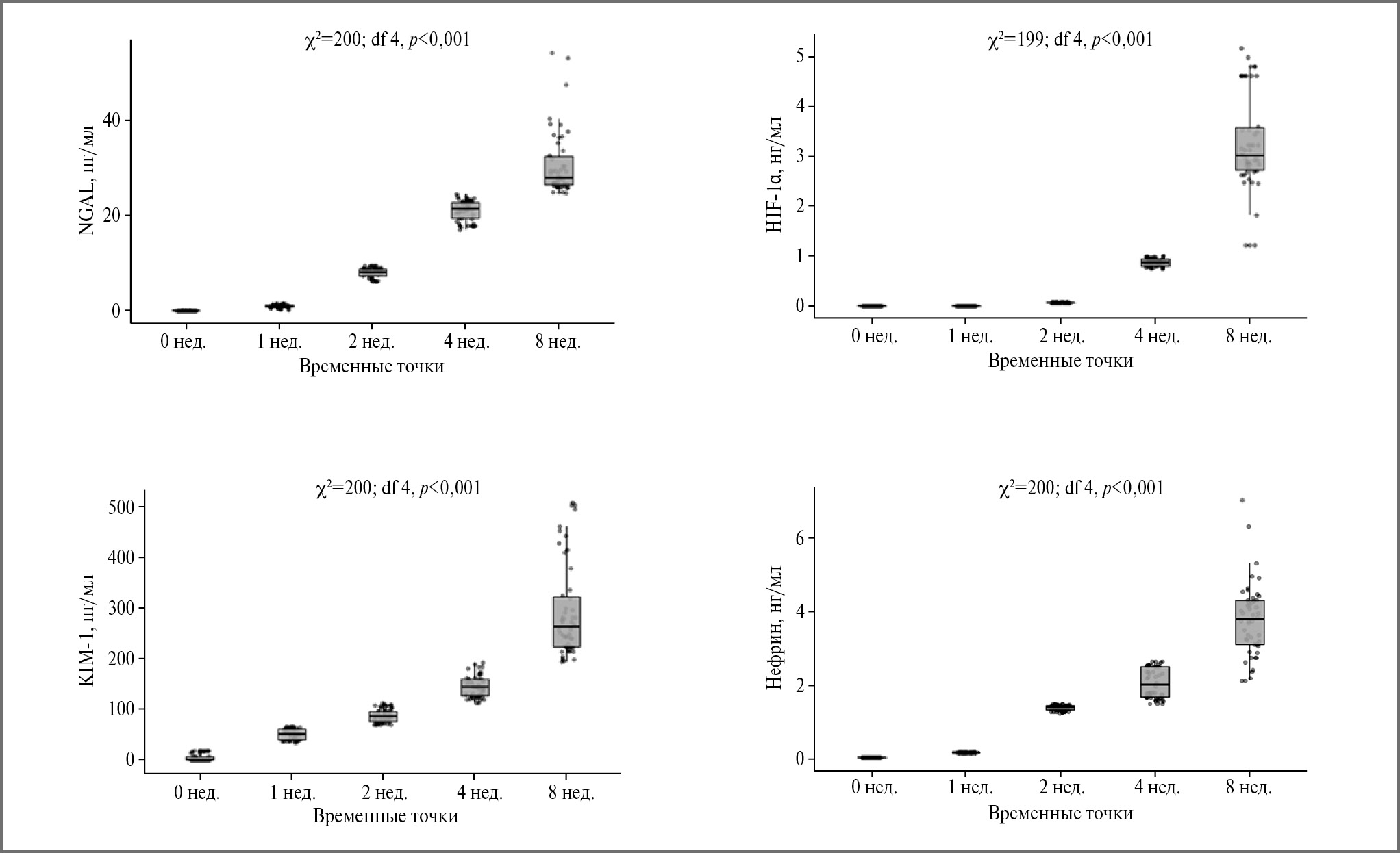 Рис. 1. Нарастание биомаркеров почечного повреждения NGAL (липокалин, ассоциированный с желатиназой нейтрофилов), KIM-1 (молекула повреждения почек-1), HIF-1α (фактор, индуцируемый гипоксией) и нефрина в течение 8 нед у пациентов, получавших терапию противоопухолевыми анти-VEGF-препаратами. / Fig. 1. An increase in biomarkers of renal damage NGAL (Neutrophil Gelatinase-Associated Lipocalin), KIM-1 (Kidney Injury Molecule-1), HIF-1α (Hypoxia-Inducible Factor 1-alpha) and nephrin for 8 weeks in patients treated with antitumor anti-VEGF drugs.