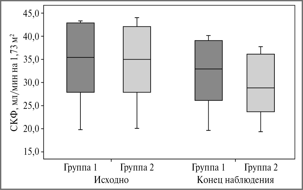 Согласно критериям соответствия отобраны 85 больных ХБП IIIB–IV стадий, они включены в исследование и случайным образом распределены в группы 1 (n=43) и 2 (n=42). Группы сопоставимы по исходным демографическим и клиническим характеристикам (табл. 1).