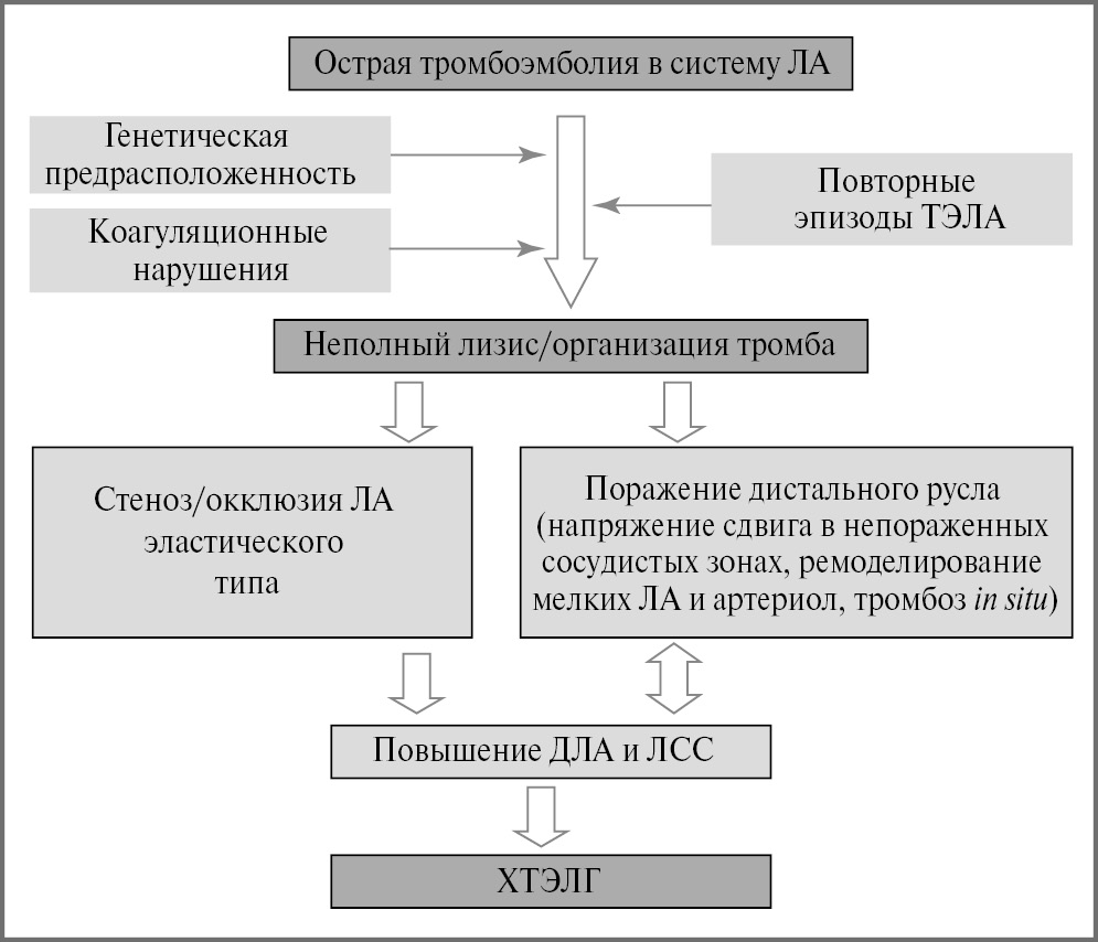 ХТЭЛГ имеет сложную патофизиологию из-за нарушений как в эластических, так и резистивных ЛА [2]. В отличие от острой тромбоэмболии ЛА (ТЭЛА) отсутствует линейная корреляция между выраженностью обструкции легочных сосудов и степенью повышения ЛСС [3]. Морфологическим субстратом ХТЭЛГ также служат генерализованный спазм артериол малого круга кровообращения вследствие высвобождения из тромбоцитов и эндотелия вазоконстриктивных веществ, вторичное тромбообразование, прогрессирующее ремоделирование мелких ЛА и артериол. Если общая степень сужения легочного сосудистого русла достигает 50–60%, развивается ХТЭЛГ.