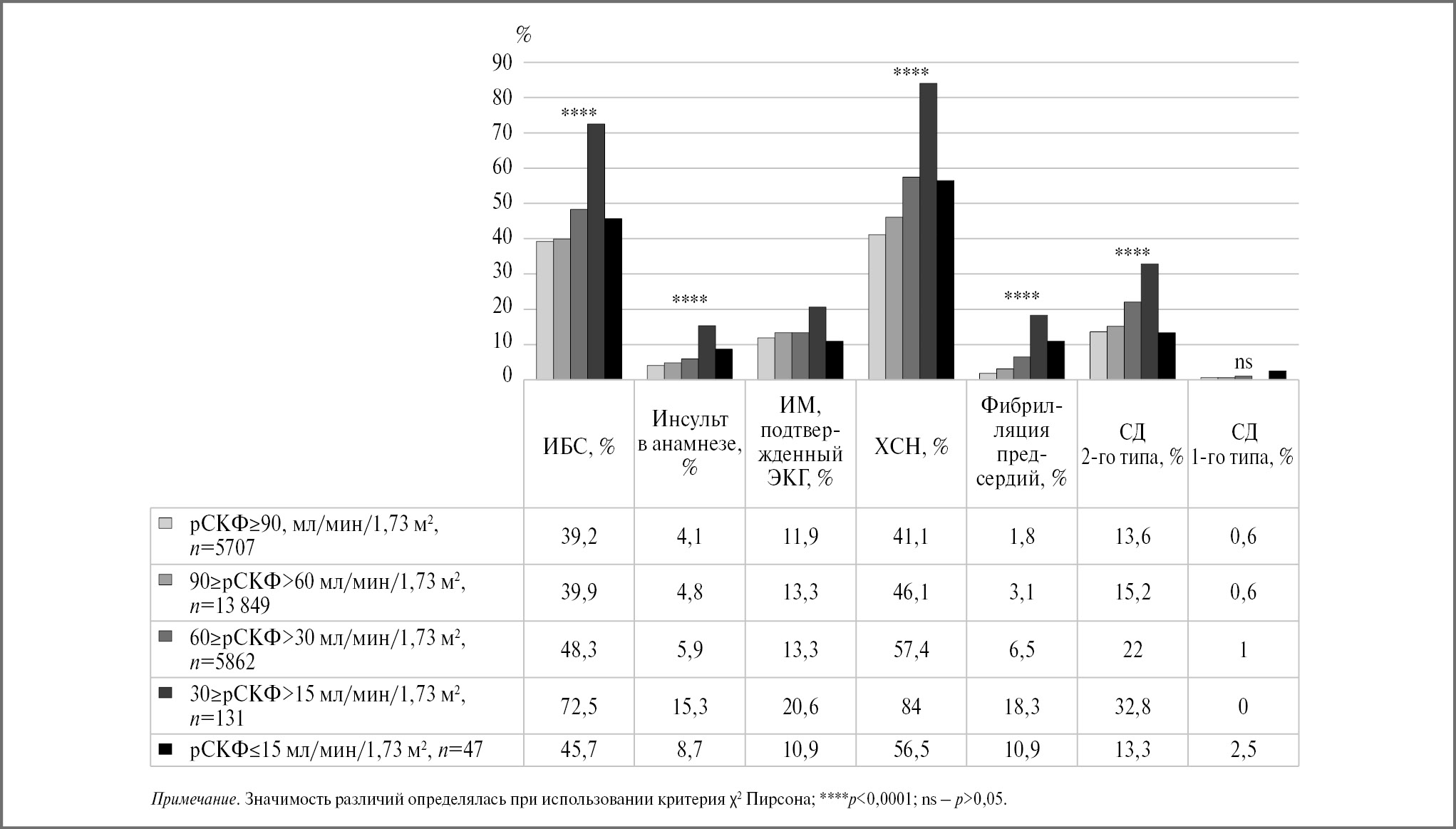 Materials and methods. The study was carried out on the basis of the AH registry data (n=43 133; 2005–2019 years). Glomerular filtration rate (eGFR) was calculated using the CKD-EPI formula; renal structure and albuminuria were not evaluated. The analysis was performed using the SPSS software (version 22; SPSS Inc).