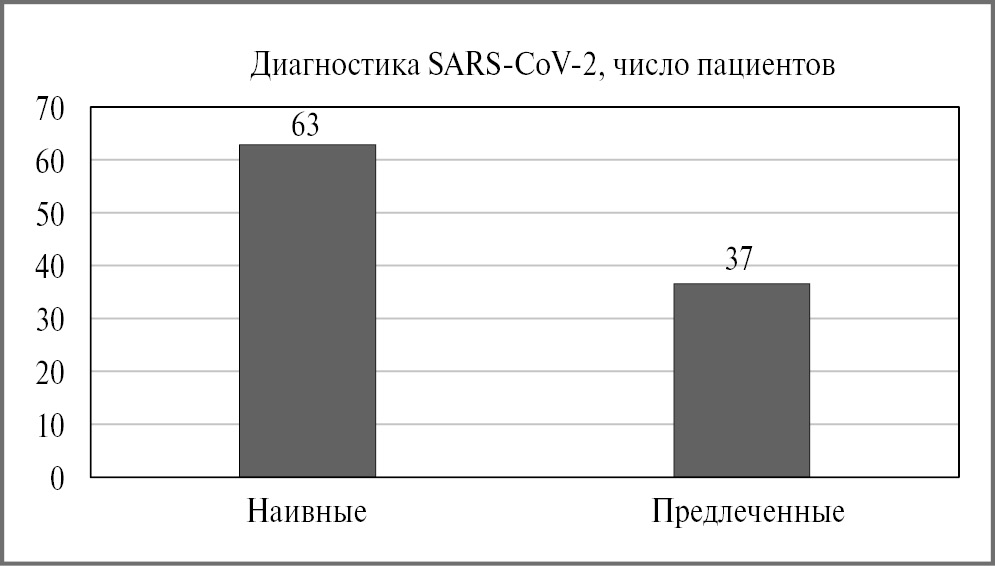 В соответствии с целями исследования у пациентов обеих когорт во время каждого визита собиралась информация о результатах диагностики на SARS-CoV-2 и тяжести течения в случае его диагностики. Из 1294 включенных в исследование пациентов SARS-CoV-2 диагностирован у 82 (6,5%): из них первичных – 52 (63%); предлеченных – 30 (37%); рис. 8.