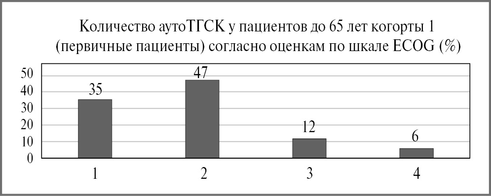 АутоТГСК в когорте 1 в возрасте до 65 лет выполнены у 17 (7%) из 245 пациентов. При этом 6 (35%) пациентов имели оценку 1 балл по шкале ECOG; 8 (47%) – 2 балла, 2 (12%) – 3 балла и 1 (6%) – 4 балла (рис. 9).