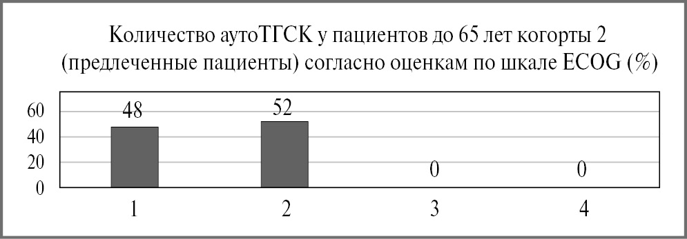 АутоТГСК в когорте 2 в возрасте до 65 лет выполнены у 23 (20%) из 115 пациентов. Из них 11 (48%) имели оценку 1 балл по шкале ECOG и 10 (52%) – 2 балла (рис. 10).