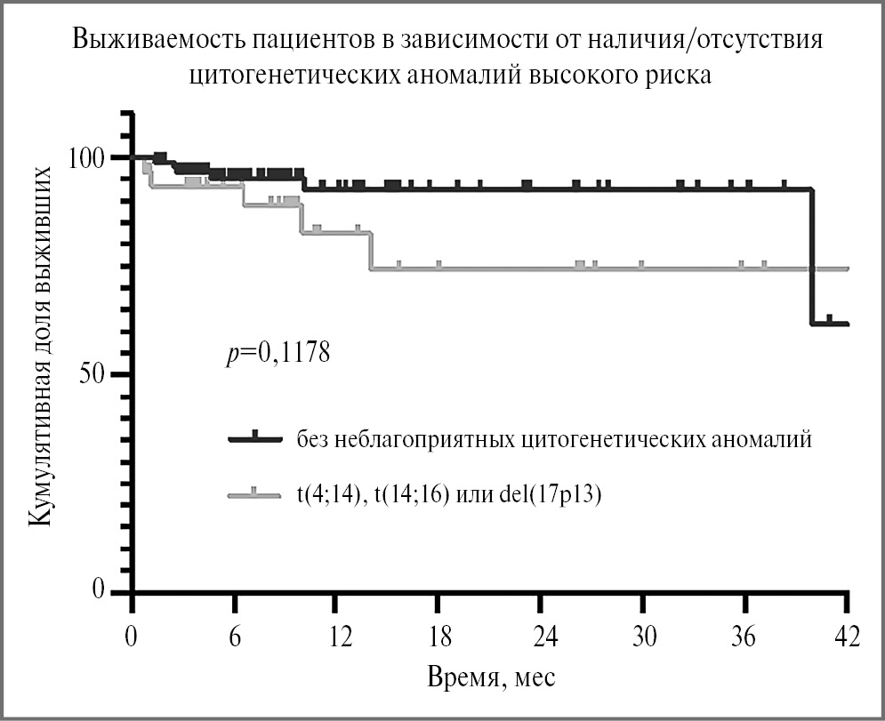 У 193 (15%) из 1294 пациентов, включенных в данный анализ, проводились цитогенетические исследования. Критериями цитогенетических аномалий высокого риска являлись: делеция 17p, транслокация 4;14, транслокация 14;16. Цитогенетические аномалии высокого риска выявлены у 30 (16%) из 193 пациентов. При медиане срока наблюдения за пациентами 9,2 мес (0,7–41) достоверных различий не выявлено (рис. 13).