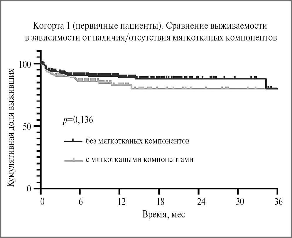Рис. 14. Показатели выживаемости пациентов когорты 1 с подтвержденным наличием или отсутствием мягкотканых компонентов.