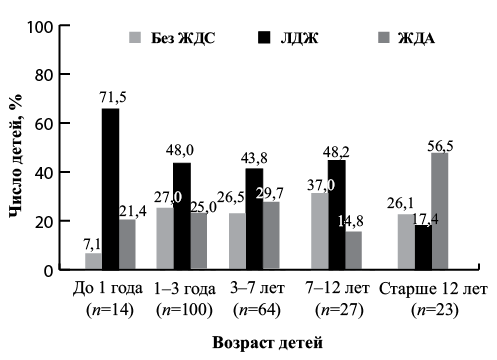 Частота ЖДА у девочек (38 человек – 30,2%) несколько превышает частоту у мальчиков (26 человек – 25,5%). Однако в структуре всех ЖДС нет существенных различий встречаемости ДЖ в зависимости от гендерной принадлежности. Так, ДЖ зафиксирован у 88 (69,8%) девочек и 79 (77,5%) мальчиков.