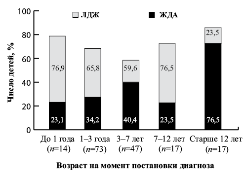 Согласно представленным на рис. 2 данным видно, что почти во всех возрастных периодах в структуре форм ЖДС преобладает ЛДЖ. Данная тенденция претерпевает изменения в старшем школьном возрасте, где превалирует ЖДА (76,5%), при этом соотношение ЛДЖ:ЖДА составляет 1:1,6.