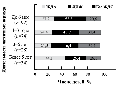 Рис. 3. Частота детей с ЖДА, ЛДЖ и без ЖДС, обследованных в остром периоде целиакии, в зависимости от длительности латентного периода. / Fig. 3. Frequency of children with IDA, LID and without IDSs, examined in the active period of celiac disease, depending on the duration of the latent period.