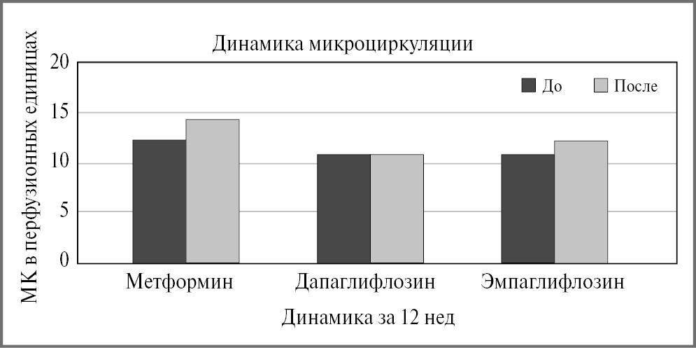 Показатели HbA1c, микроциркуляции, тканевого метаболизма и состояние резерва метаболизма у пациентов с СД 2 на терапии метформином и ингибиторами натрий-глюкозного котранспортера-2 представлены в табл. 3.