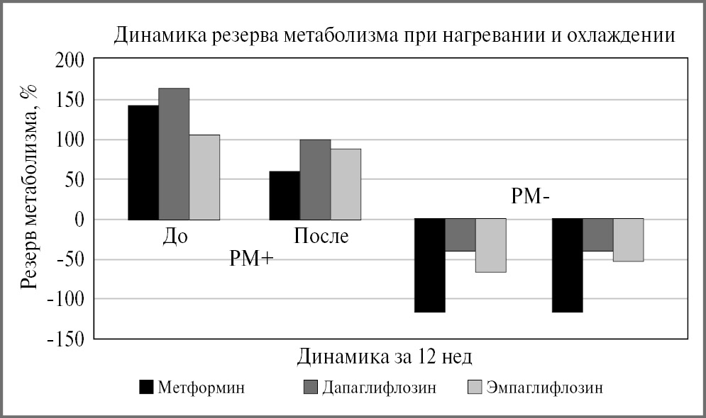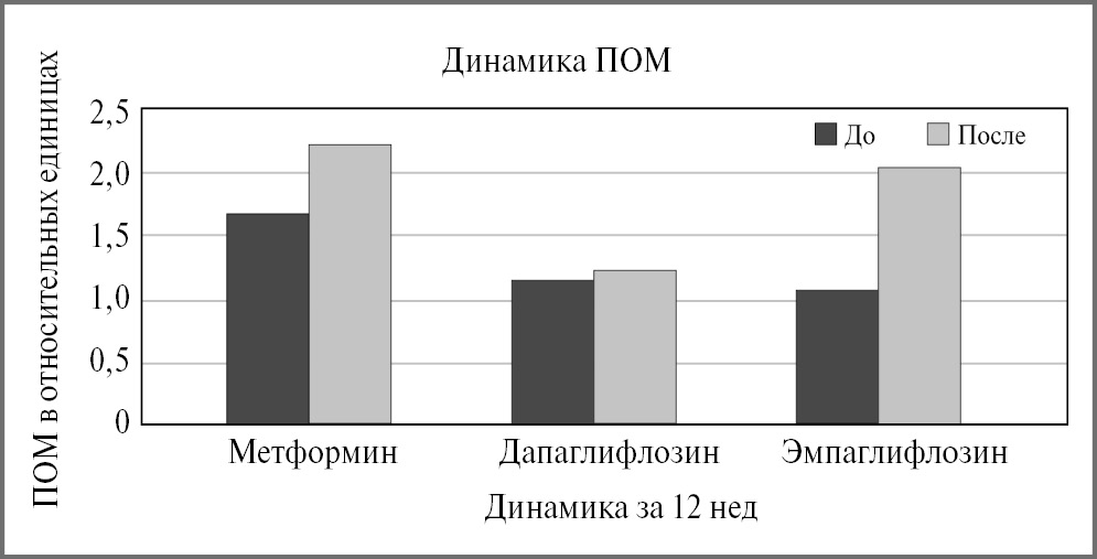На первый взгляд отмечалась выраженная положительная динамика РМ+ в группах дапаглифлозина и эмпаглифлозина, однако при статистической обработке не получено достоверности (p>0,05).