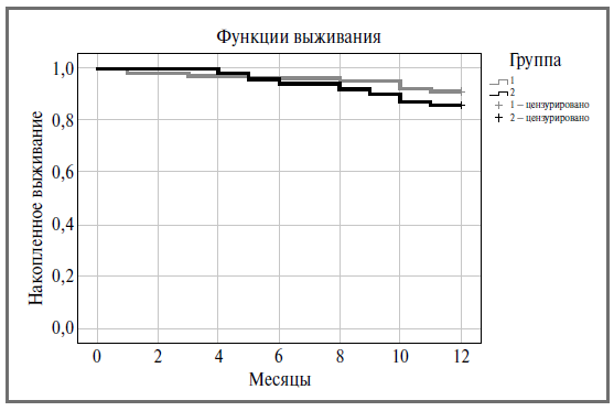 2. Рис. 1. Выживаемость пациентов (кривые Каплана–Мейера) в группе 1 (группа МСС) и группе 2 (группа сравнения) с ХСН через 12 мес наблюдения (лог-ранговый критерий, р=0,273).