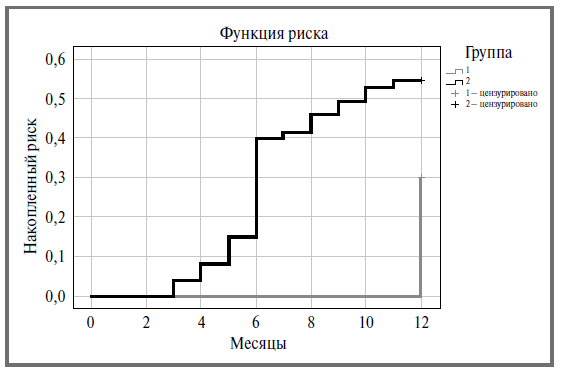 3. Рис. 2. Повторная госпитализация (кривые Каплана–Мейера) в группе 1 (группа МСС) и группе 2 (группа сравнения) в связи с декомпенсацией ХСН через 12 мес наблюдения (лог-ранговый критерий, р=0,001).