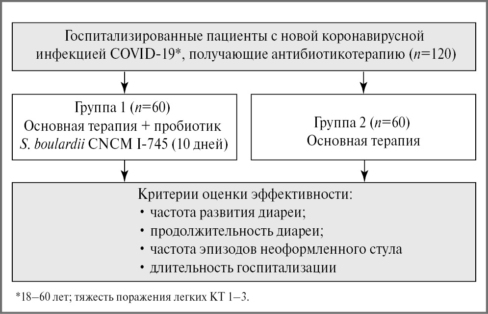 Основной процесс диагностики и лечения COVID-19 в клинике полностью базировался на актуальной версии Временных методических рекомендаций «Профилактика, диагностика и лечение новой коронавирусной инфекции (COVID-19). Версия 15 (22.02.2022)» [22]. После подписания информированного согласия и включения в исследование все пациенты были подразделены на 2 равные группы (n=60) в зависимости от назначения пробиотика S. boulardii CNCM I-745 (Энтерол®, BIOCODEX, Франция) в дополнение к основной терапии (рис. 1).